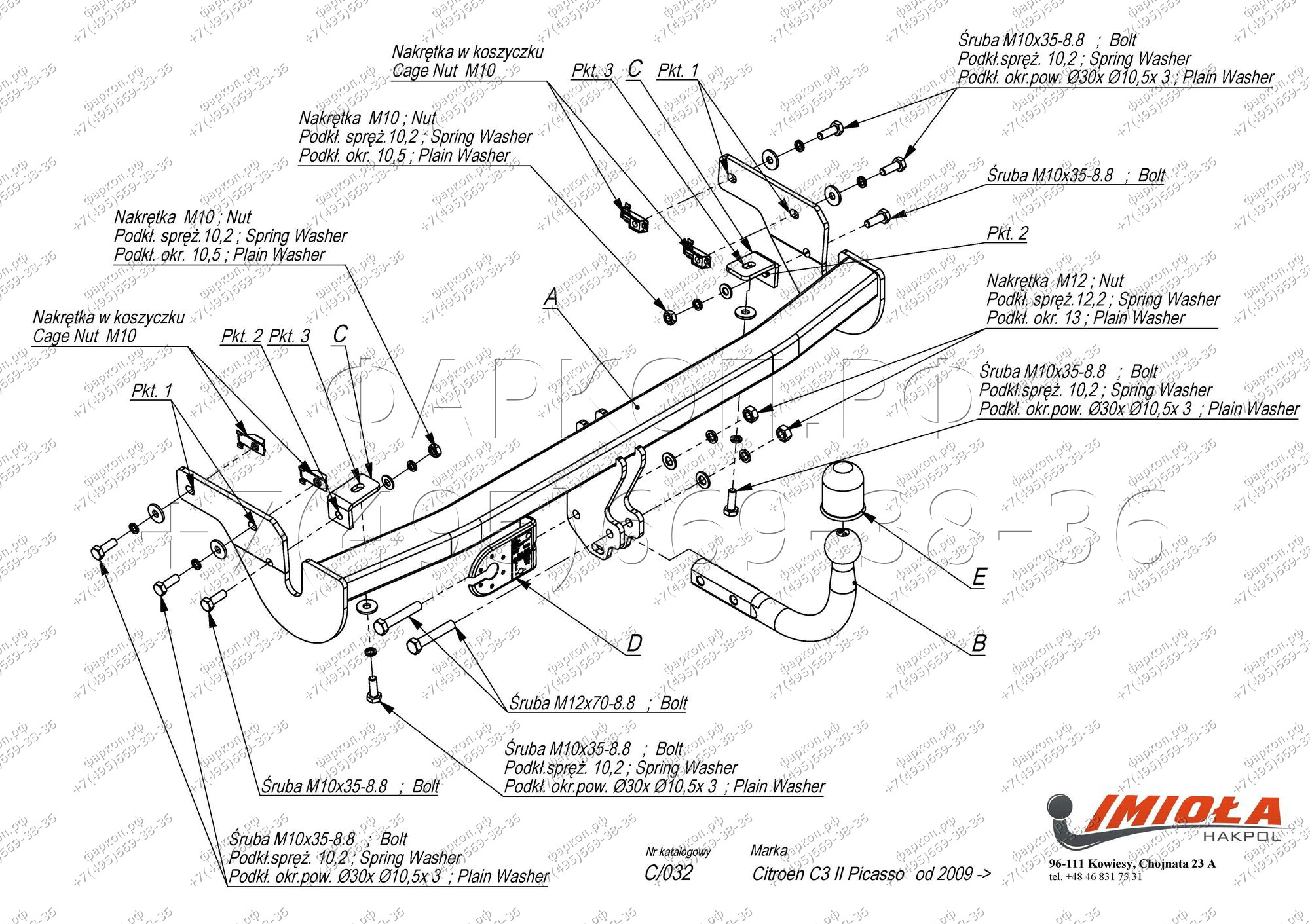 C.032 | IMIOLA | Фаркоп Citroen C3 II Picasso 2009-2017. Тип шара: A. Нагрузки: 1200/61 кг (без электрики в комплекте) | 18 990 ₽ |