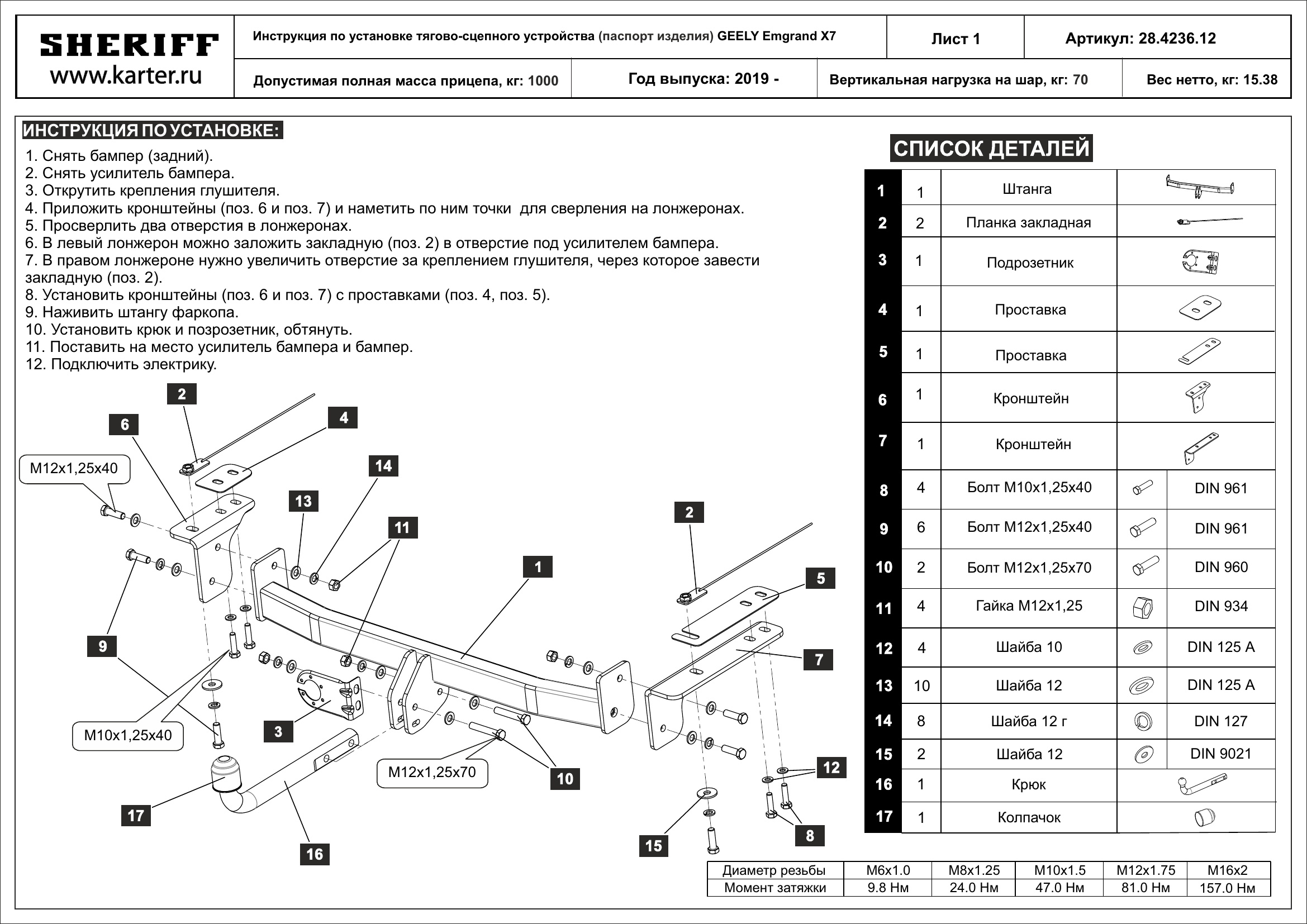 4236.12 | Sheriff | Фаркоп на Geely Emgrand X7 2019-2021 без выреза в бампере. Тип шара: A. Требуется сверление лонжеронов. Нагрузки 1200/70 кг, масса фаркопа 15,3 кг (без электрики в комплекте) | 10 340 ₽ |