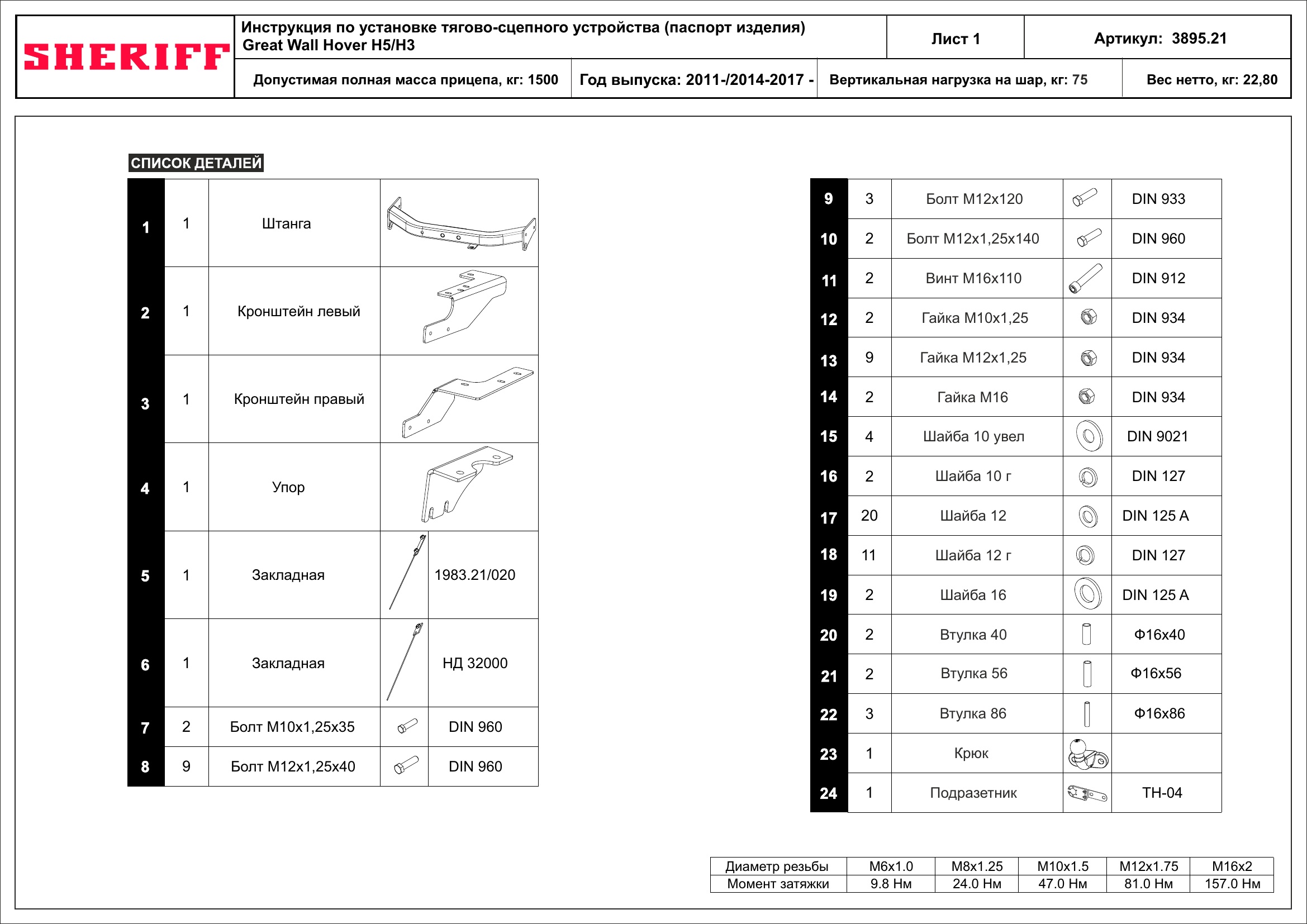 3895.21 | Sheriff | Фаркоп на Great Wall Hover H3 2010-2016, Great Wall Hover H5 2011-2016, Haval H5 2020-2021 без подрезки бампера. Тип шара: F. Нагрузки: 1500/75 кг, масса фаркопа 22,8 кг (без электрики в комплекте) | 17 590 ₽ |