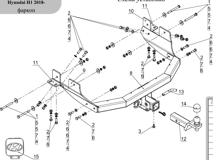 7270 | Трейлер | Фаркоп для Hyundai H1 2008-2018, 2018-2023, Hyndai Starex 2008-2018 без снятия и подрезки бампера. Тип шара: A. Нагрузки: 1300/60 кг, масса фаркопа 20,7 кг (без электрики в комплекте) | 9 670 ₽ |