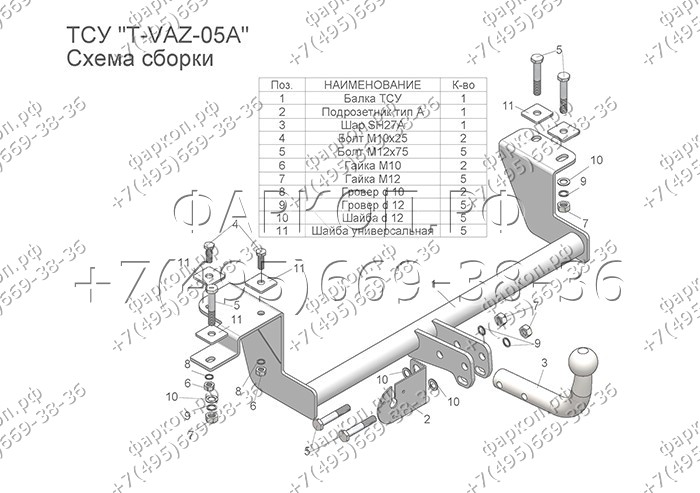 T-VAZ-05A | TAVIALS | ТСУ со съемным шаром для ВАЗ 2110 десятка, 2111 одиннадцатая, 2112 двенадцатая, 2170 Приора седан, 2171 Приора универсал, 2172 Приора хетчбек. без снятия и выреза бампера. Нагрузки: 900/75 кг, масса фаркопа 9,36 кг, требуется 5 сверлений (без электрики в комплекте) | 5 590 ₽ |