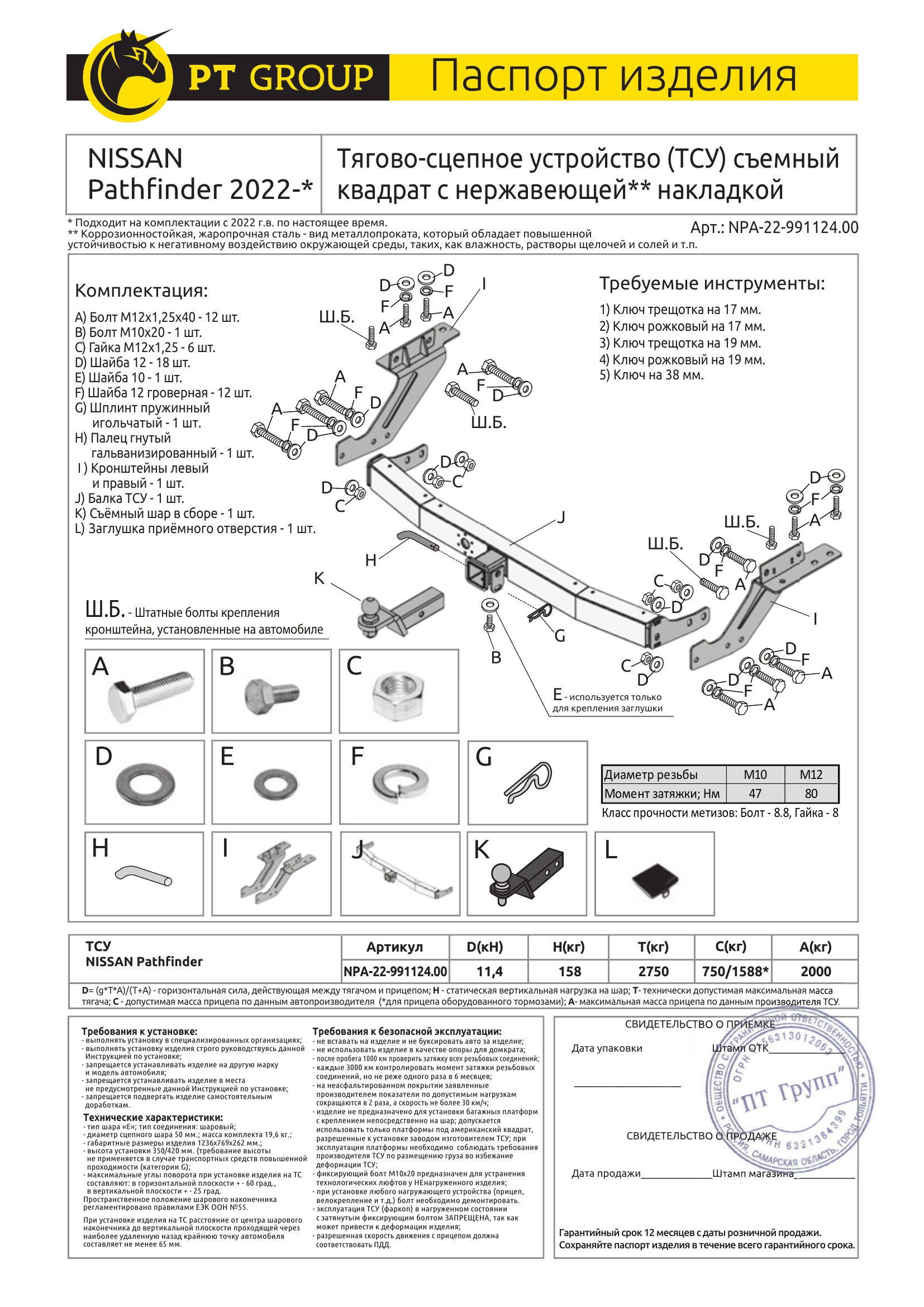 NPA-22-991124.00 | PT GROUP | Фаркоп с нержавеющей накладкой на Nissan Pathfinder R53 2022- без подрезки бампера. Тип шара: E (легкосъемный шар под квадрат). Нагрузки: 2750/158 кг, масса фаркопа 18 кг (без электрики в комплекте) | 17 720 ₽ |