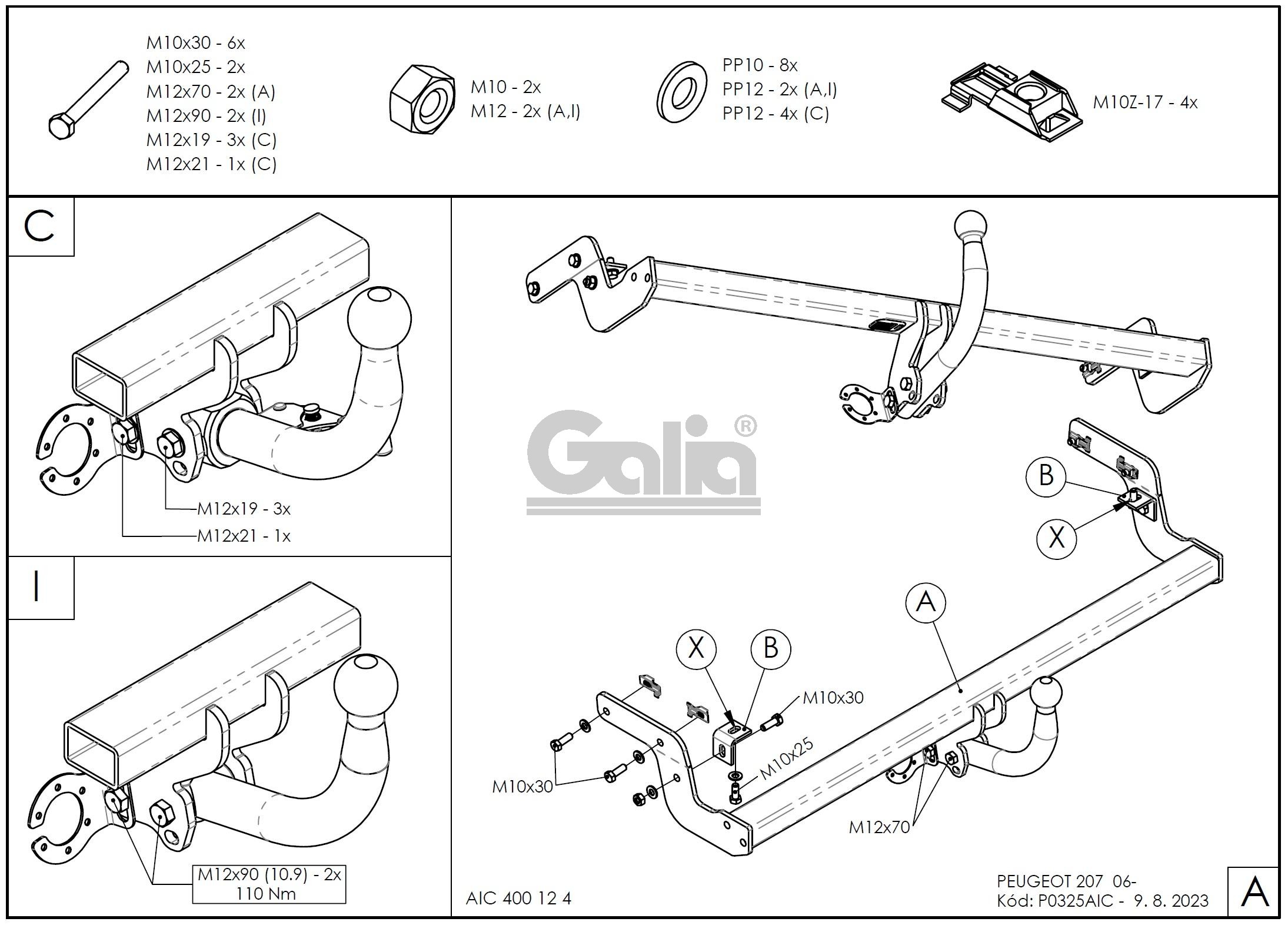 P032C | GALIA | Полностью оцинкованный фаркоп на Peugeot 207 хетчбек 2006-2012. Тип шара: C (горизонтальный съемный). Установка без снятия и выреза бампера. Нагрузки: 1150/46 кг, масса фаркопа 17,36 кг | 27 340 ₽ |