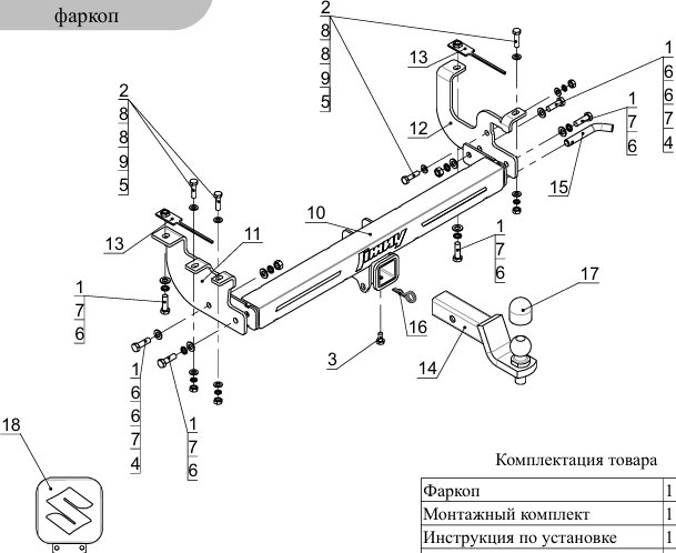 S050C | GALIA | Полностью оцинкованный фаркоп на Suzuki Jimny 1998-2018. Тип шара: C (горизонтальный съемный). Установка без снятия и выреза бампера. Нагрузки: 1400/75 кг, масса фаркопа 14,87 кг | 27 990 ₽ |