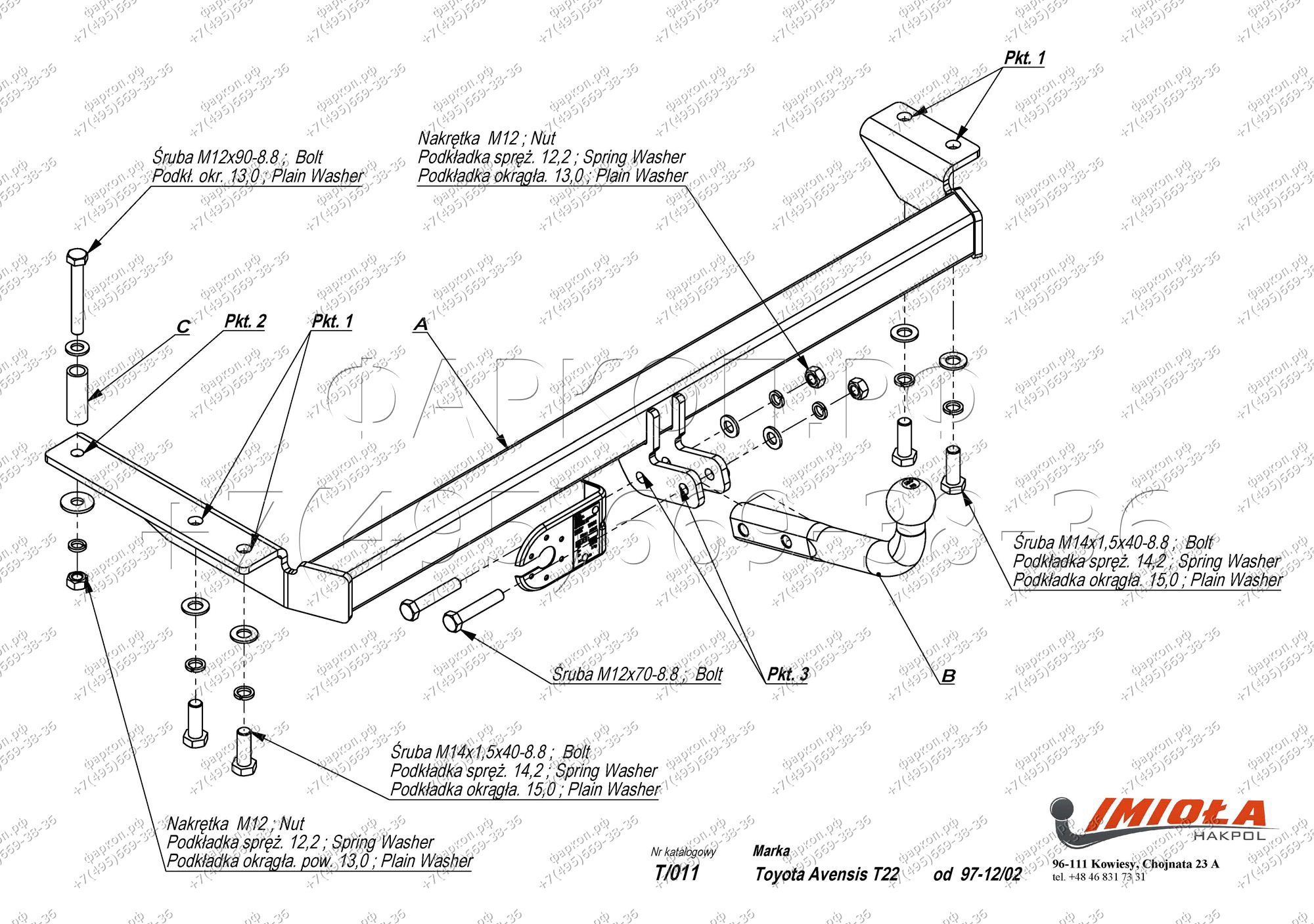T.011 | IMIOLA | Фаркоп Toyota Avensis универсал T22 1997-2002. Тип шара: A, необходима подрезка бампера. Нагрузки: 1500/75 кг (без электрики в комплекте) | 13 990 ₽ |