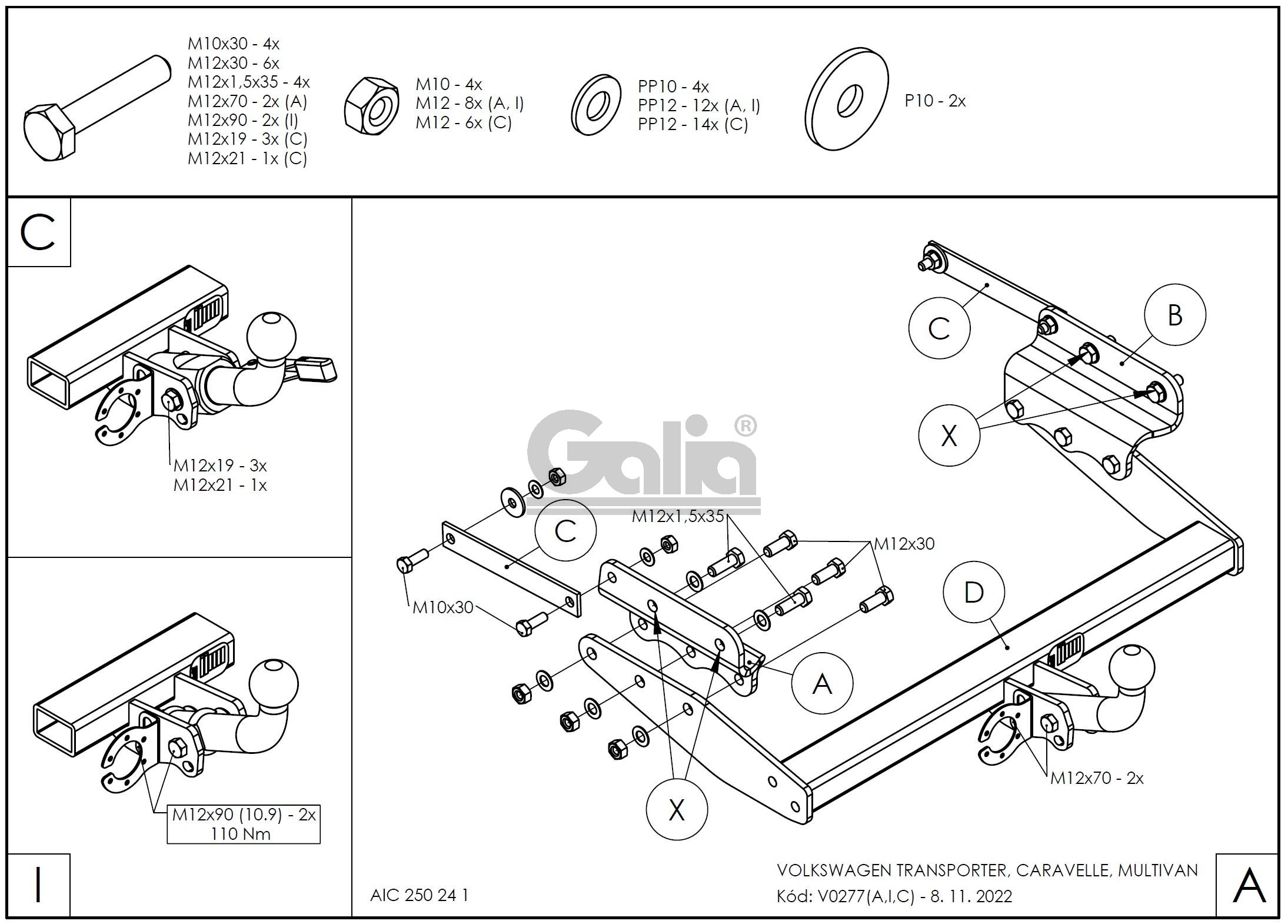 V064C | GALIA | Полностью оцинкованный фаркоп на Volkswagen Transporter / Caravelle / Multivan T5 2003-2015, T6 2015-2024, включая 4WD, включая модели с парктрониками. Тип шара: C (горизонтальный съемный). Без выреза бампера. Нагрузки: 2800/120 кг, масса фаркопа 15,97 кг | 30 490 ₽ |