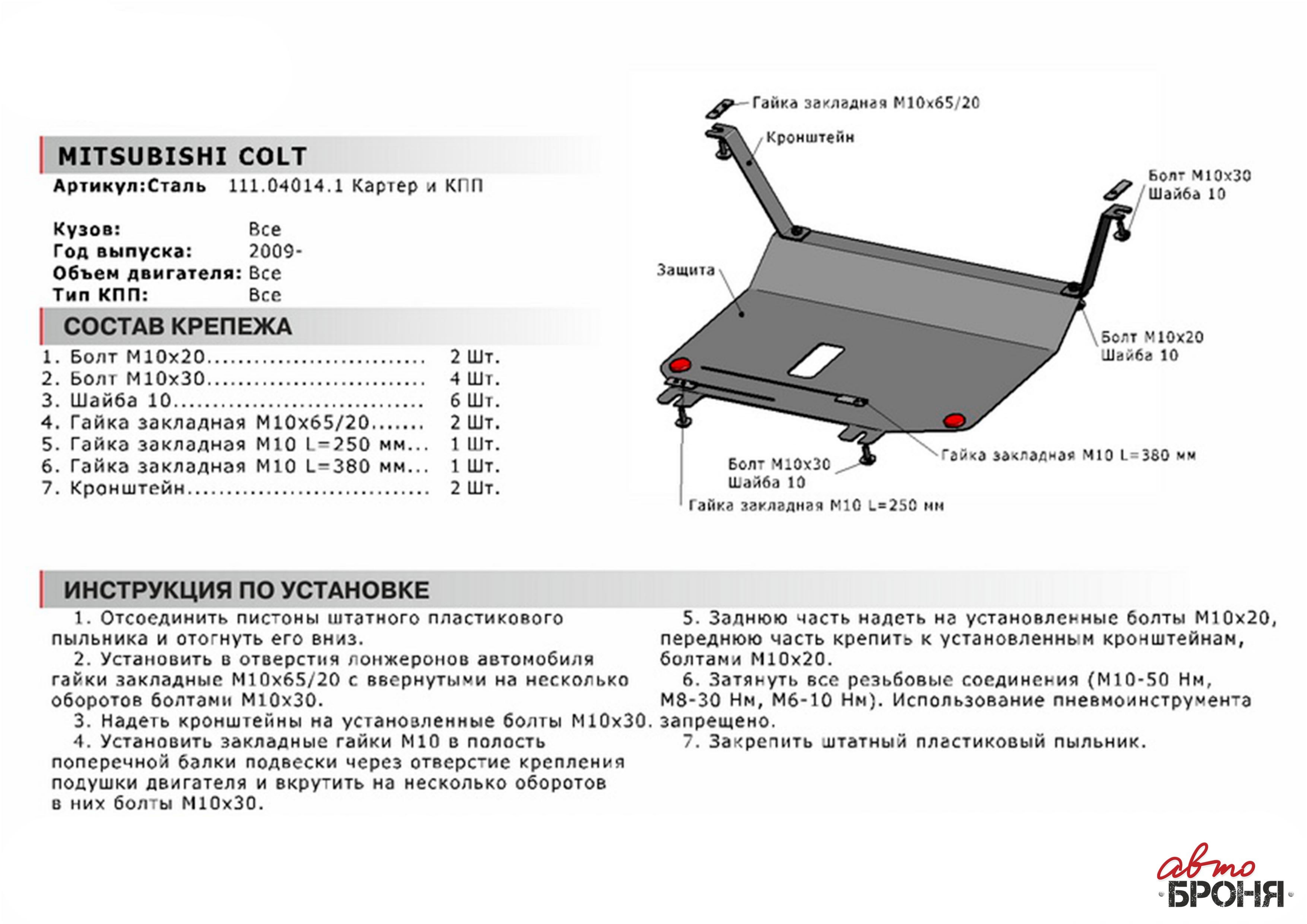 111.04014.1 | АвтоБроня | Защита картера + КПП (сталь 1,8 мм) + комплект крепежа для Mitsubishi Colt 2008-2013 (V - 1.3; 1.5) | 3 710 ₽ |