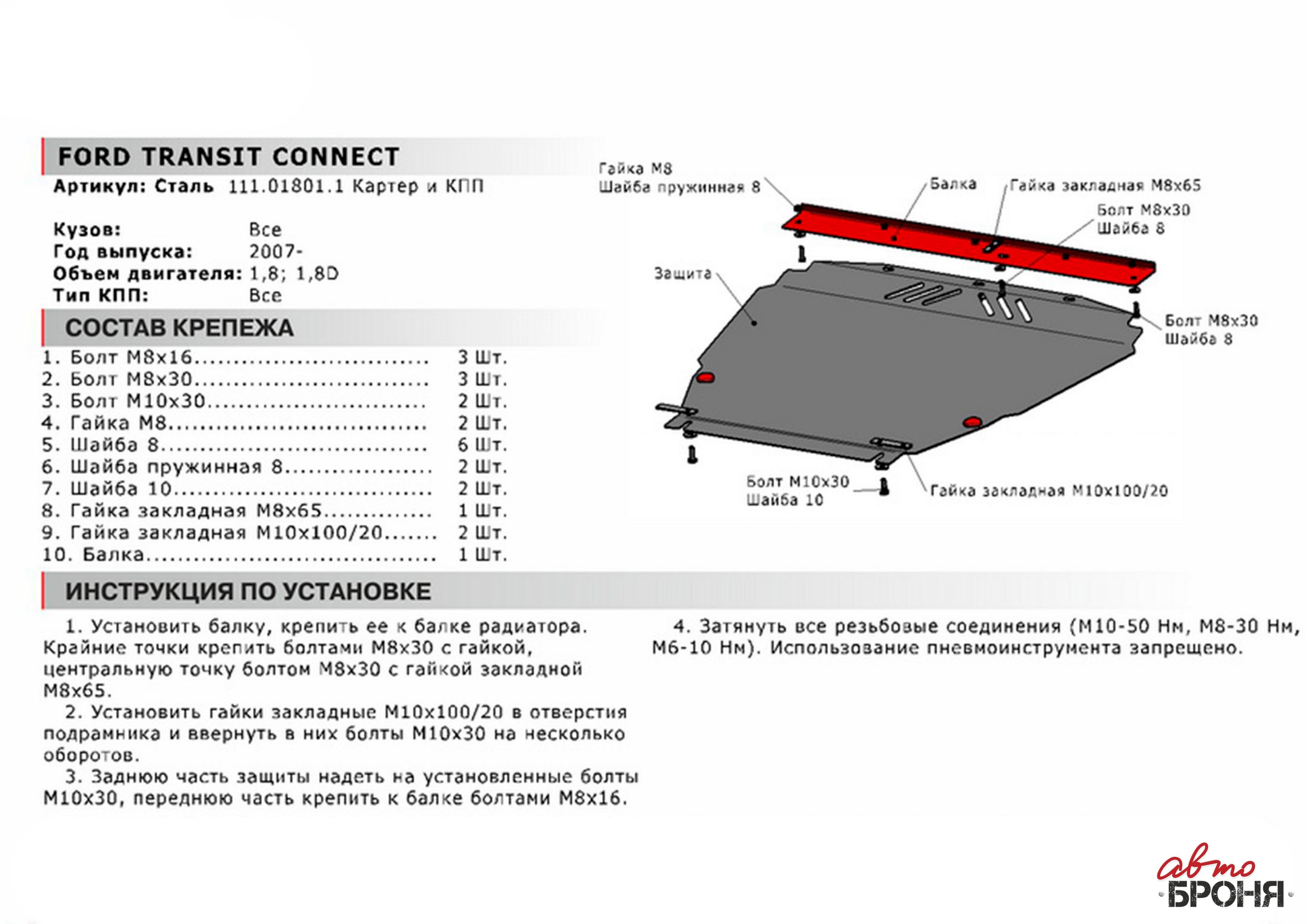 111.01801.1 | АвтоБроня | Защита картера + КПП (сталь 1,8 мм) + комплект крепежа для Ford Transit Connect 2002-2013 (V - 1.8d) | 8 000 ₽ |
