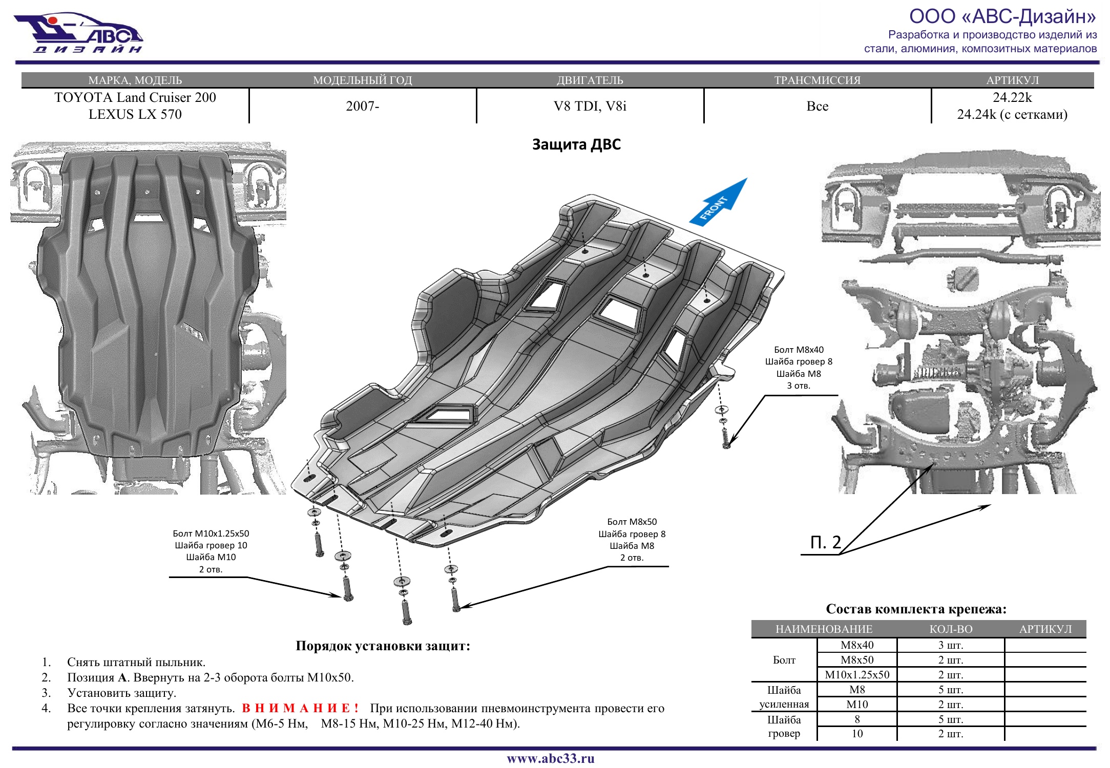 24.27k | АВС-Дизайн | Защита картера, КПП и РК (композит 10 мм) для Toyota Land Cruiser 200 2015-2021 (V - 4.5d), Lexus LX 2015-2021 (V - 4.5d) (с сеткой) (2 части) | 33 490 ₽ |