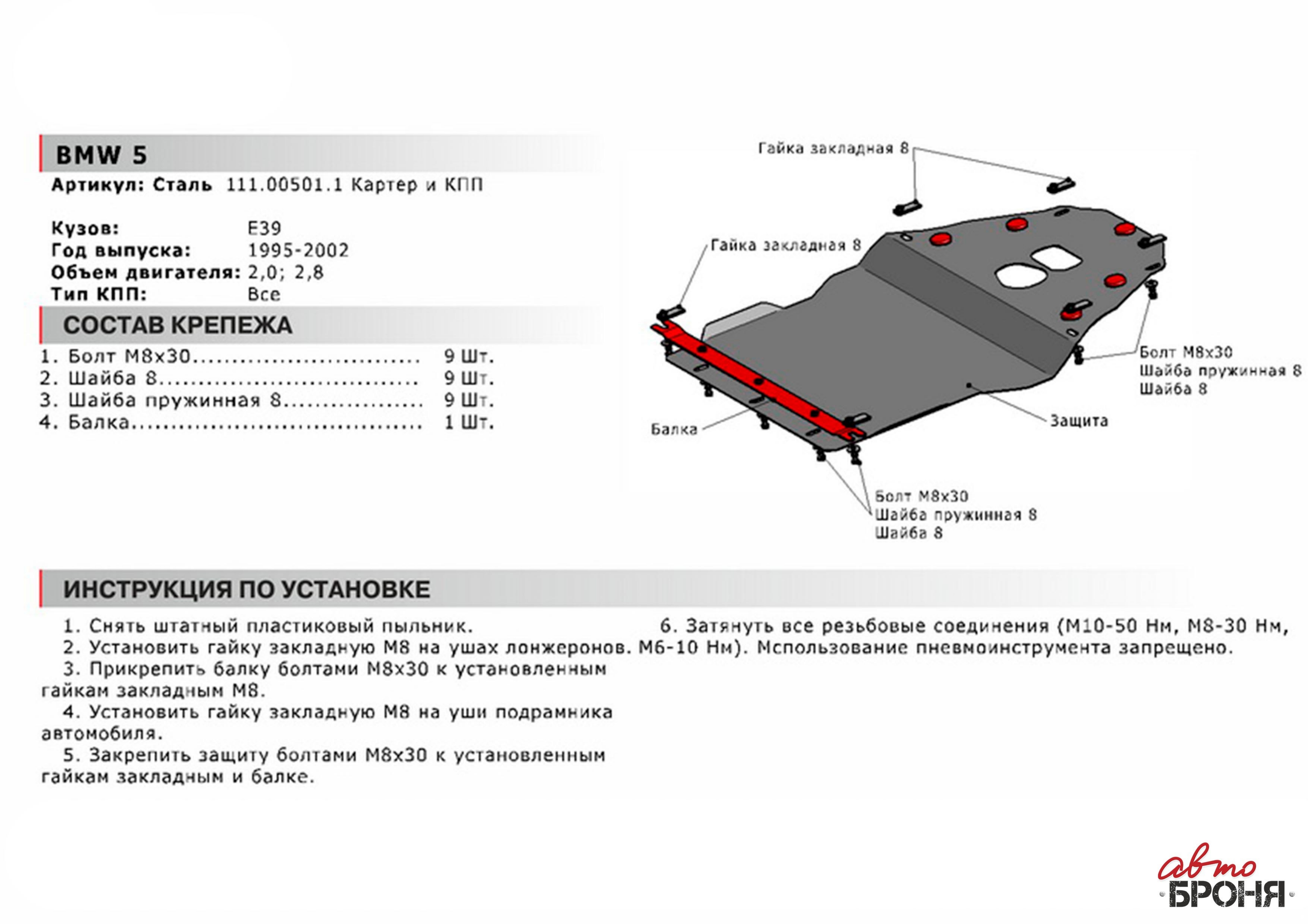 111.00501.1 | АвтоБроня | Защита картера + КПП (сталь 1,8 мм) + комплект крепежа для BMW 5-Series 1995-2002 (V - 2.0; 2.8) | 2 980 ₽ |
