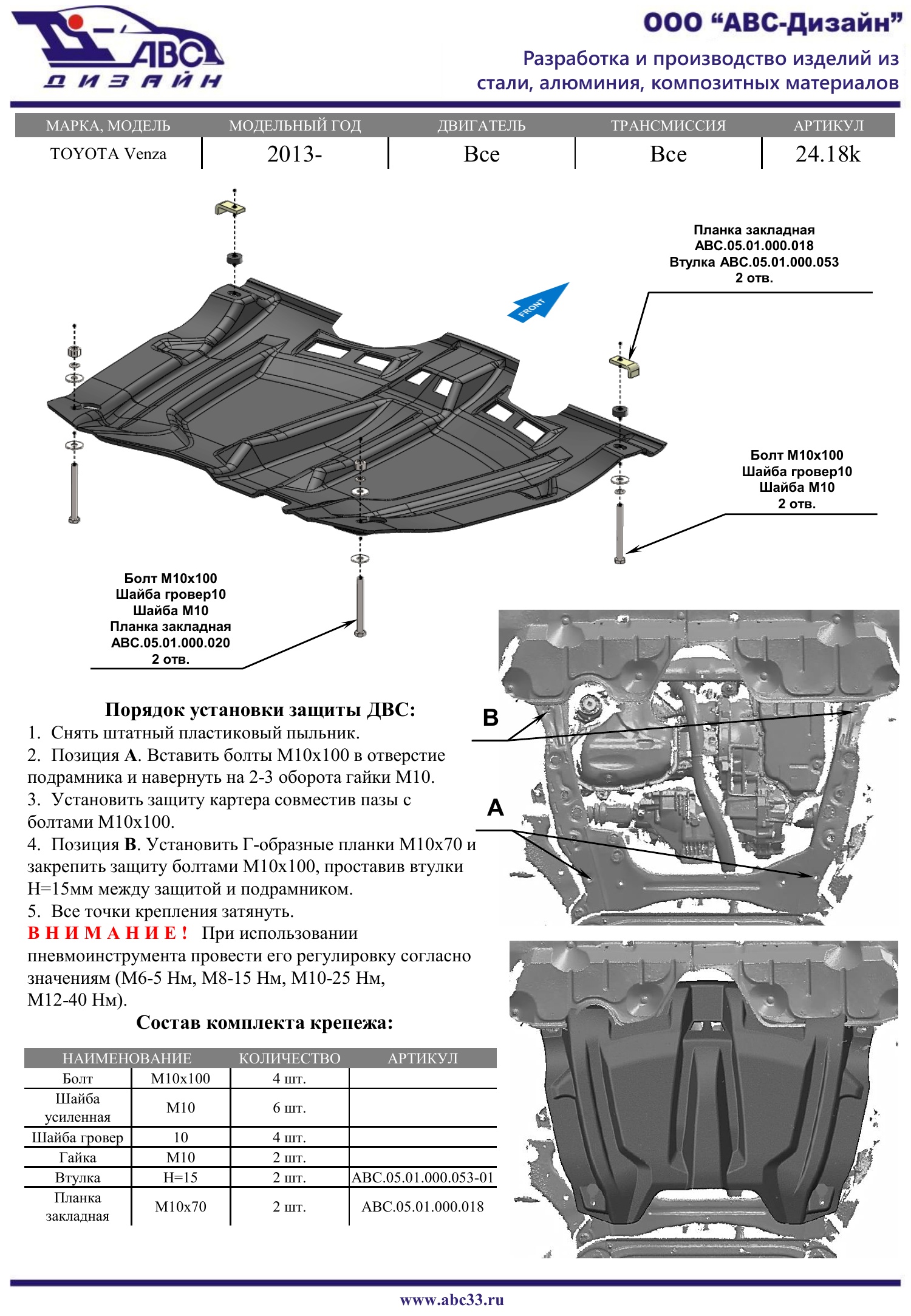 24.18k | АВС-Дизайн | Защита картера, КПП (композит 8 мм) для Toyota Venza 2013-2017 (V - 2.7; АКПП; AWD) | 11 190 ₽ |