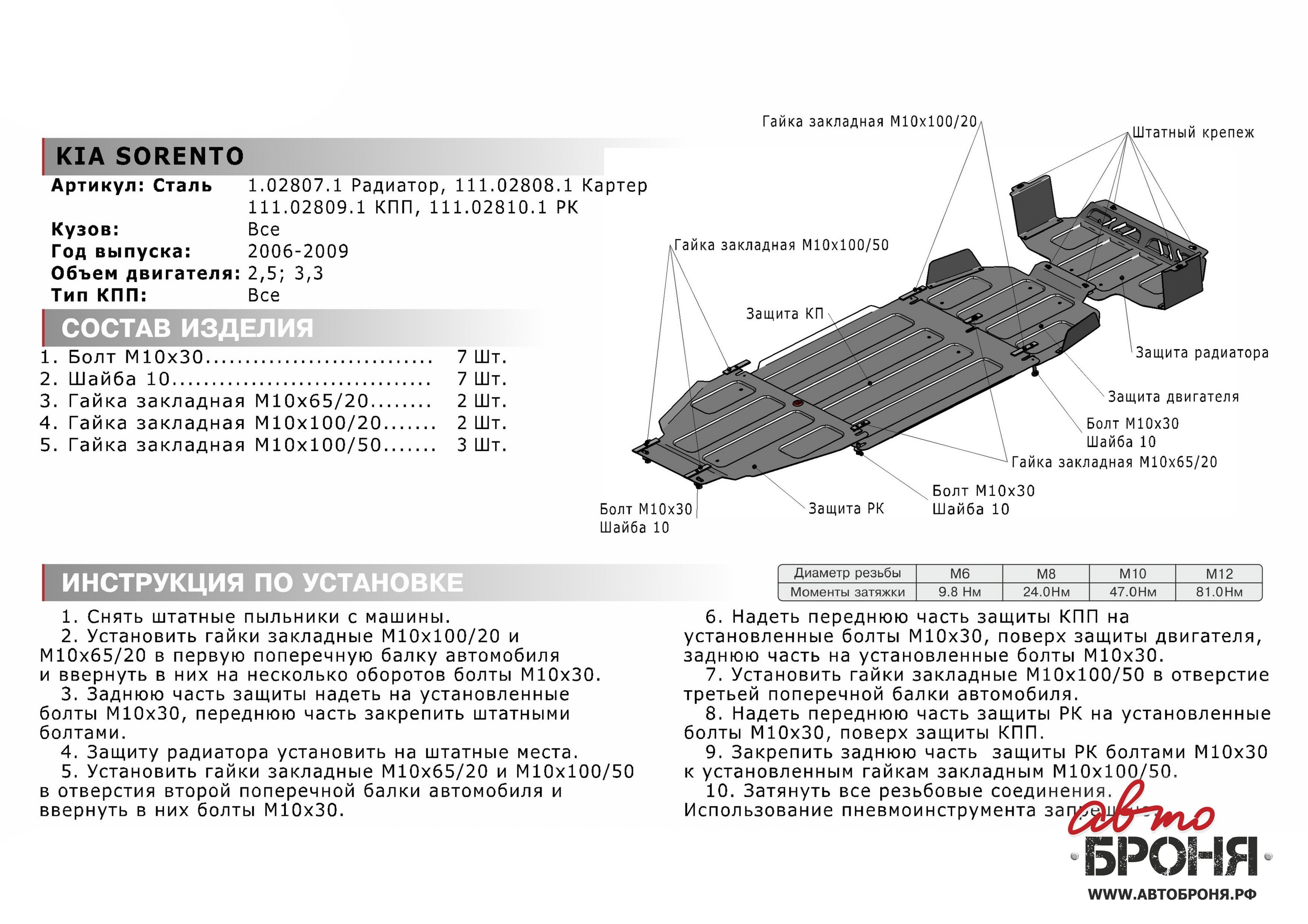 01019 | Motodor | Усиленная защита картера двигателя, КПП, переднего дифференциала, радиатора (2 мм, сталь) для Kia Sorento 2006-2009 | 11 590 ₽ |