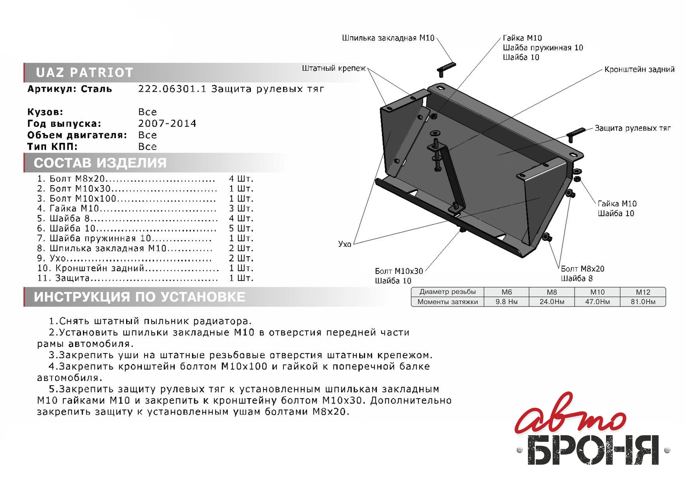 222.06301.1 | АвтоБроня | Защита рулевых тяг (сталь 3 мм) + комплект крепежа для UAZ Patriot 2007-2014 (V - все) | 3 560 ₽ |