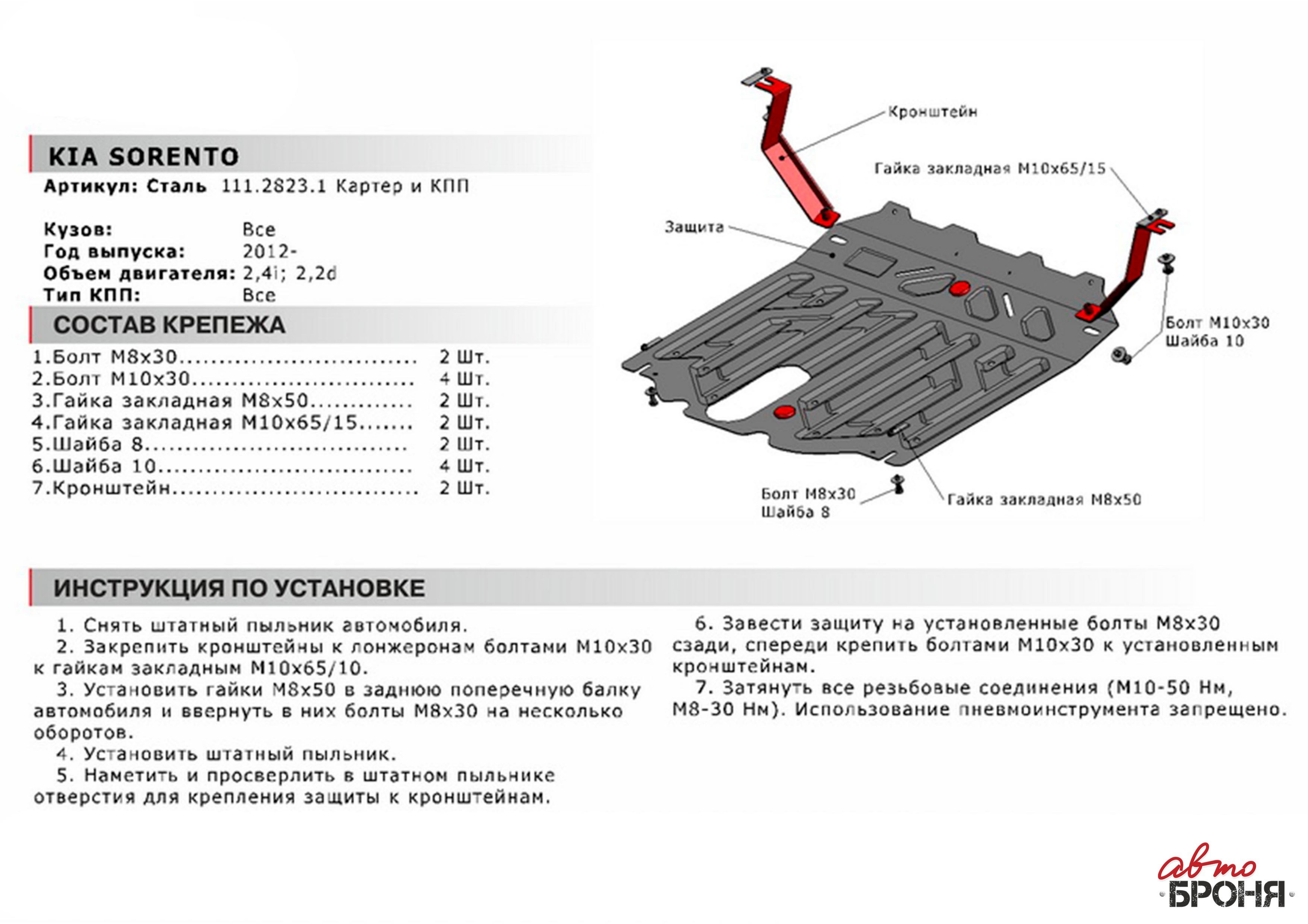 111.02823.1 | АвтоБроня | Защита картера + КПП (сталь 1,8 мм) + комплект крепежа для Kia Sorento 2012-2020 (V - 2.2d; 2.4) | 5 390 ₽ |