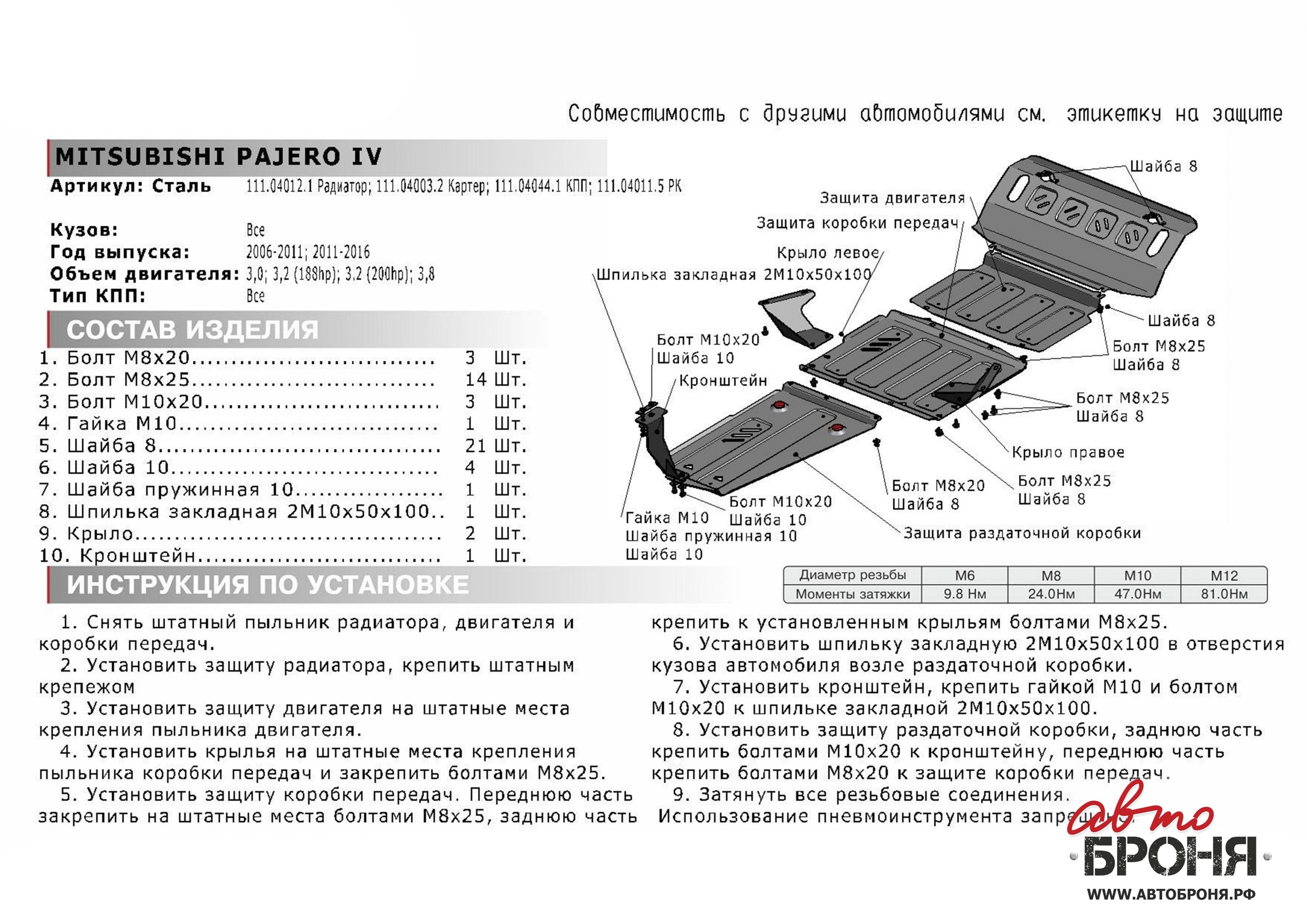 111.04044.1 | АвтоБроня | Защита КПП (сталь 1,8 мм) + комплект крепежа для Mitsubishi Pajero IV 2006-2020 (V - 3.0 188 л.с.; 3.2d 200 л.с.; 3.8), Mitsubishi Pajero III 1999-2006 (V - все) | 4 880 ₽ |