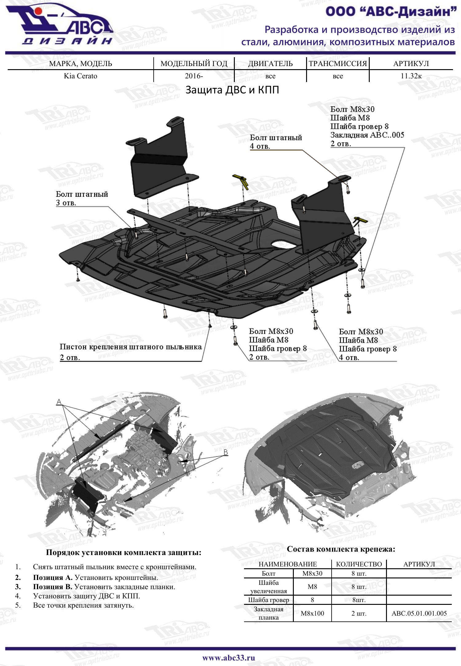 11.32k | АВС-Дизайн | Защита картера, КПП (композит 6 мм) для Kia Cerato III 2016-2019 (V - все) | 15 490 ₽ |