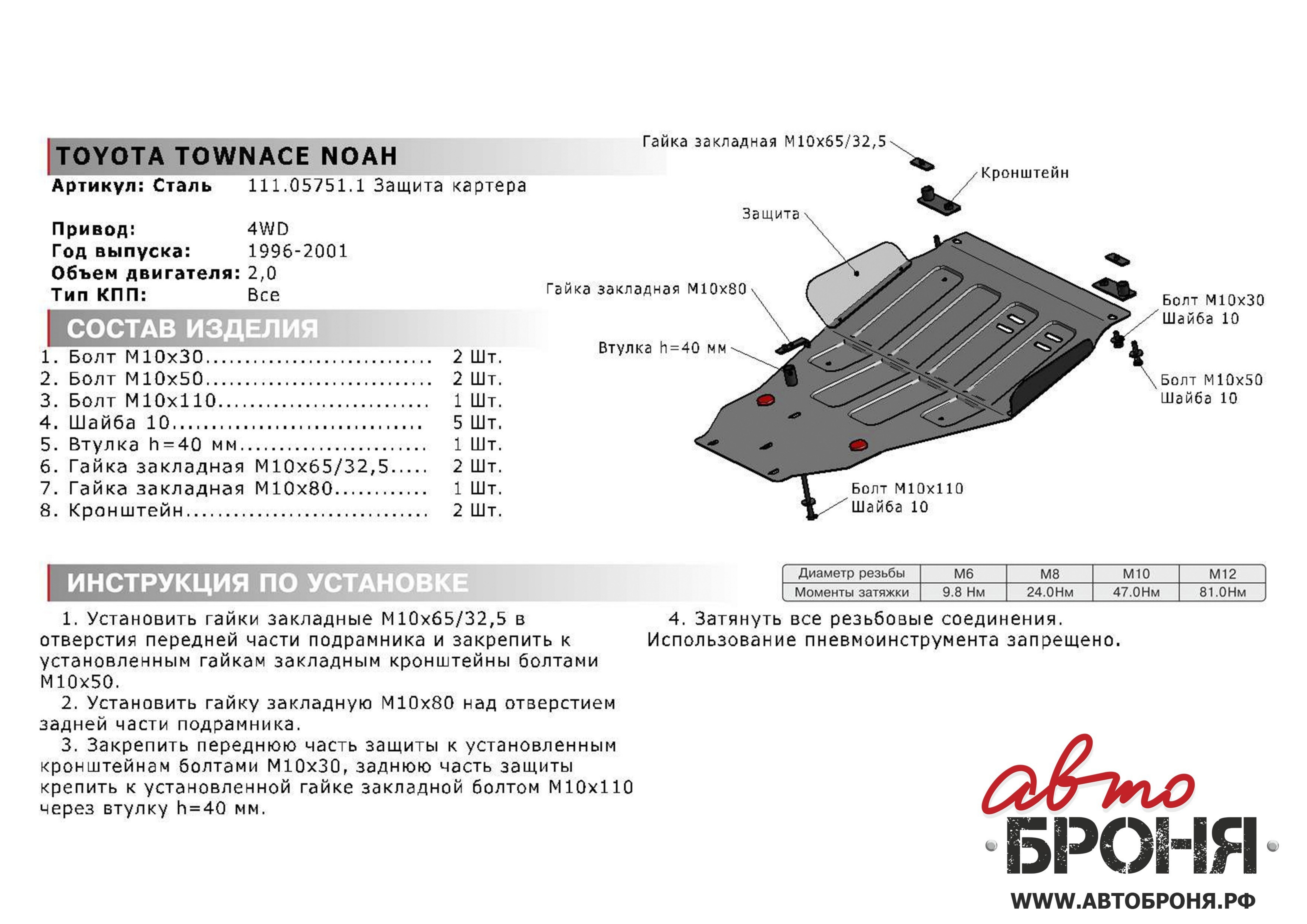 111.05751.1 | АвтоБроня | Защита картера (сталь 1,8 мм) + комплект крепежа для Toyota Townace Noah 1996-2001 (V - 2.0, 4WD) | 3 880 ₽ |