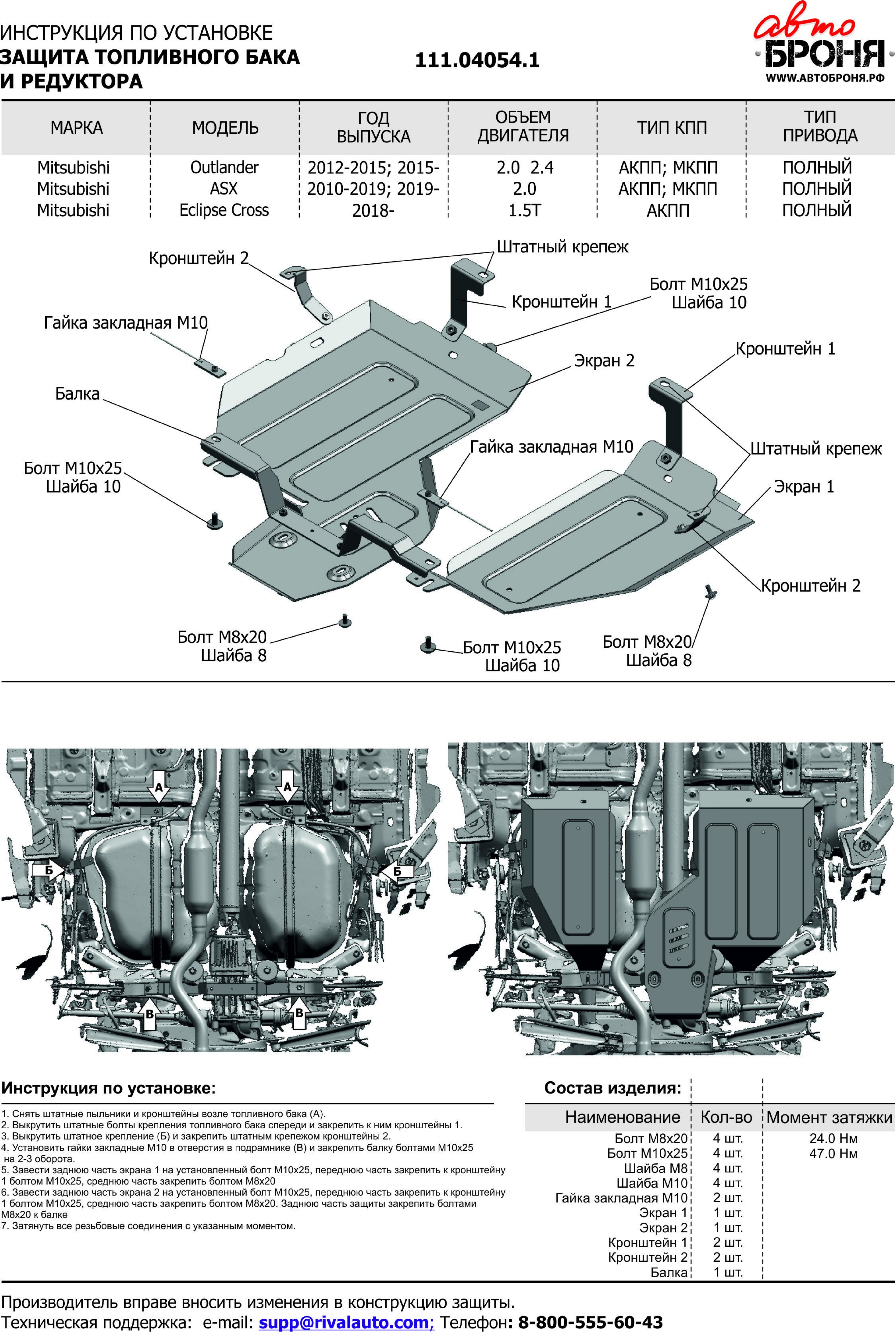 111.04054.1 | АвтоБроня | Защита топливного бака + редуктора (сталь 1,8 мм) + комплект крепежа для Mitsubishi Outlander 2012-2022 (V - 2.0; 2.4 4WD), Mitsubishi ASX 2010-2022 (V - 2.0, 4WD), Mitsubishi Eclipse Cross 2018- (V - 1.5, 4WD) | 5 580 ₽ |