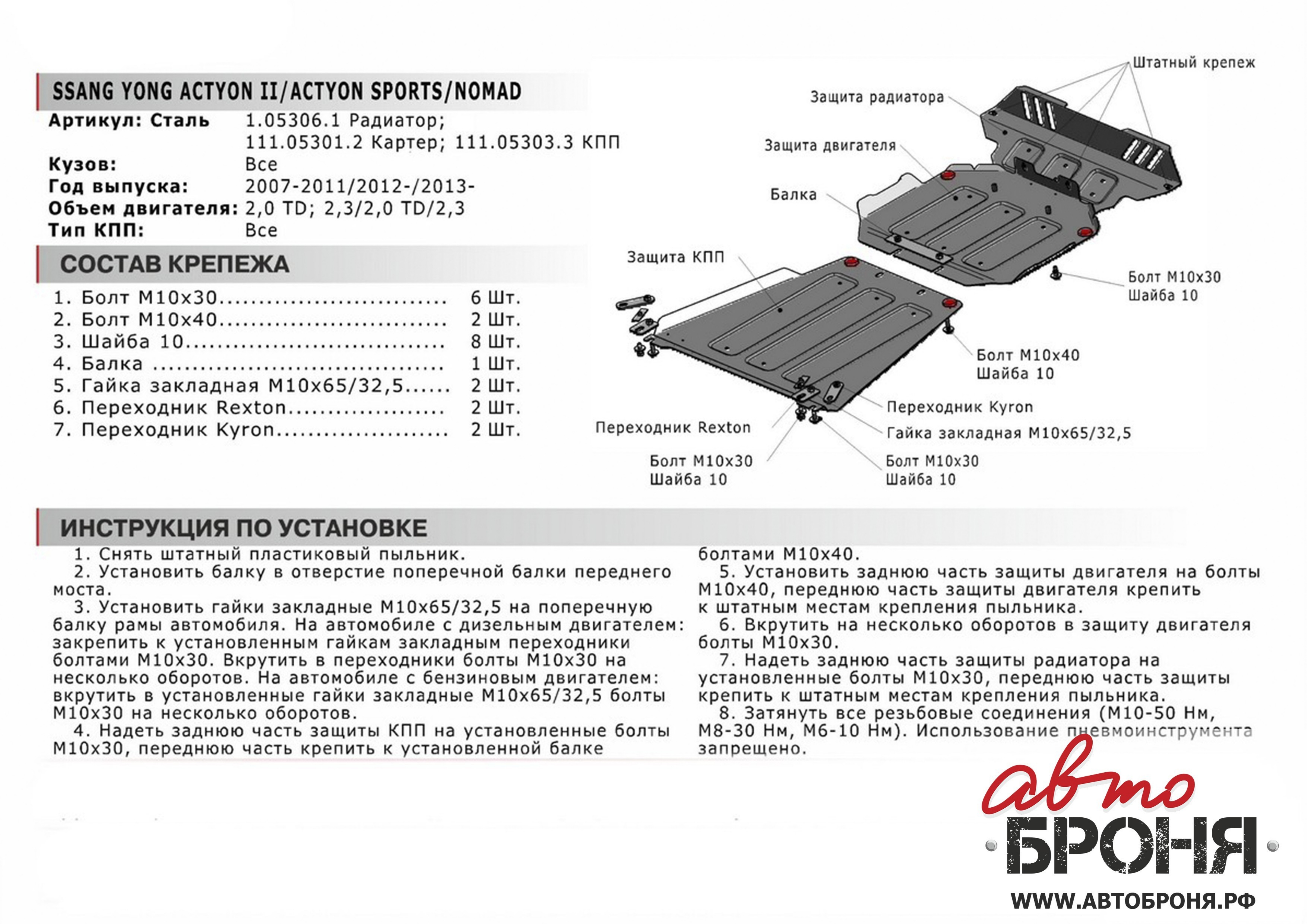 111.05303.3 | АвтоБроня | Защита КПП (сталь 1,8 мм) + комплект крепежа для SsangYong Actyon Sports 2012-2016 (V - 2.0d), SsangYong Kyron 2007-2015 (V - 2.0d; 2.3), SsangYong Nomad 2013- (V - 2.3), SsangYong Rexton 2007-2017 (V - 2.7d; 3.2), SsangYong Actyon 2007-2011 (V - 2.0d; 2.3) | 4 510 ₽ |