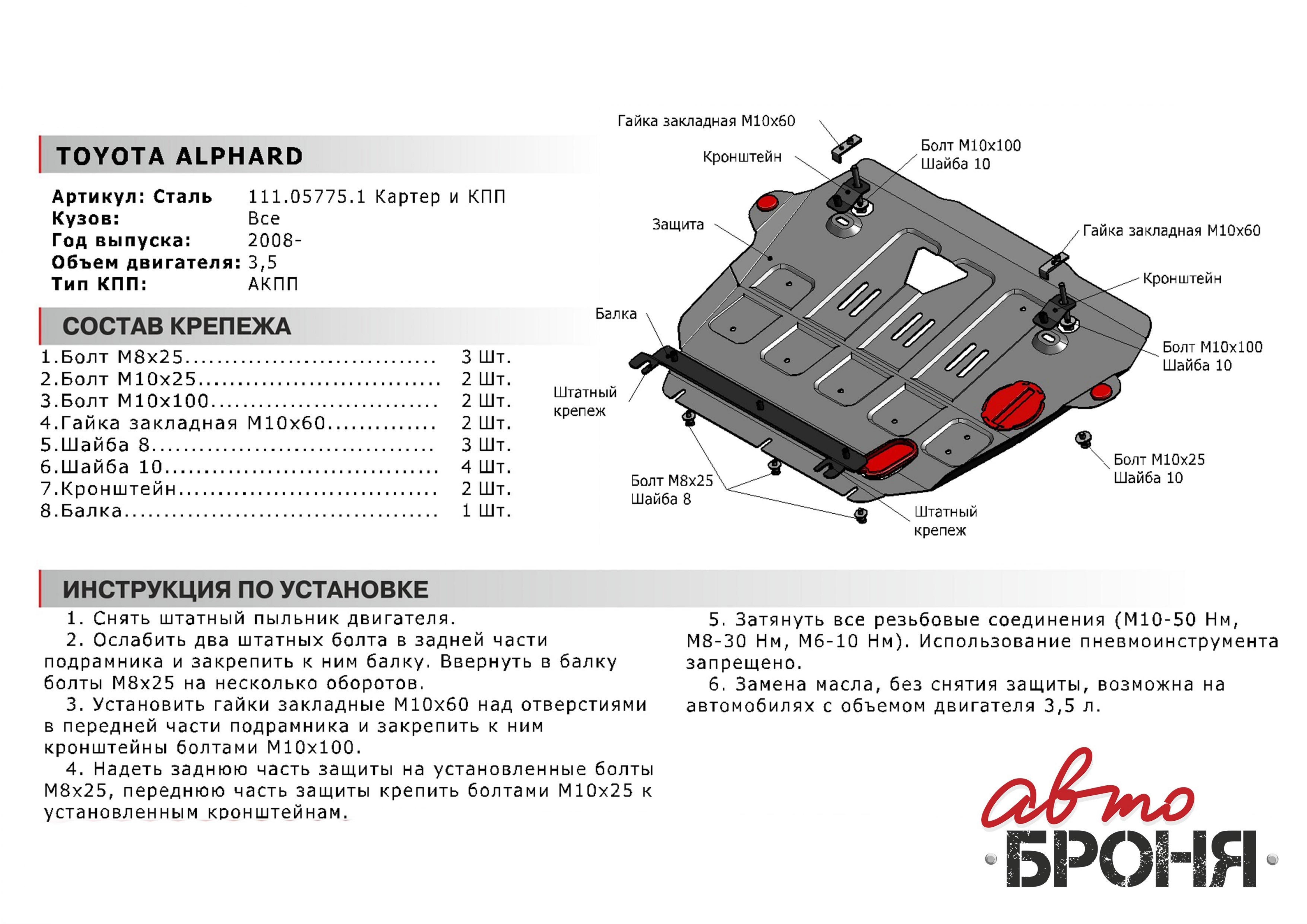 111.05775.1 | АвтоБроня | Защита картера + КПП (сталь 1,8 мм) + комплект крепежа для Toyota Alphard 2008-2015, 2015-2023 (V - 3.5) | 6 710 ₽ |