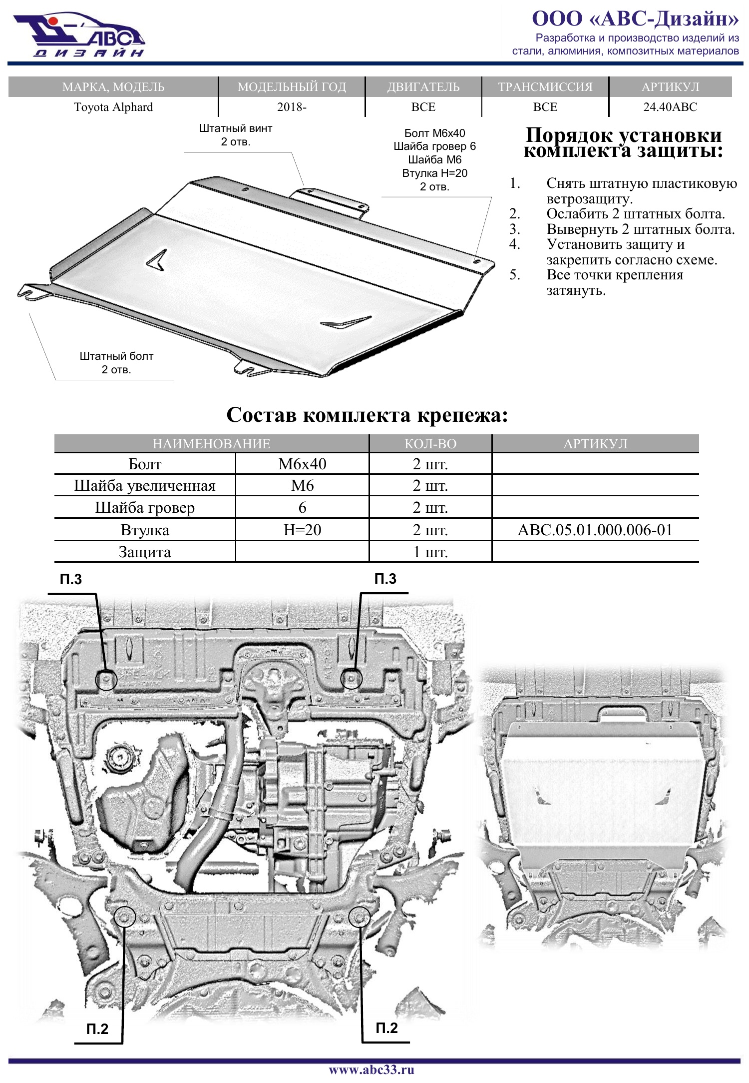 24.40ABC | АВС-Дизайн | Защита картера ДВС, КПП (алюминий 4 мм) для Toyota Alphard 2018-2023 (V - все) | 15 790 ₽ |