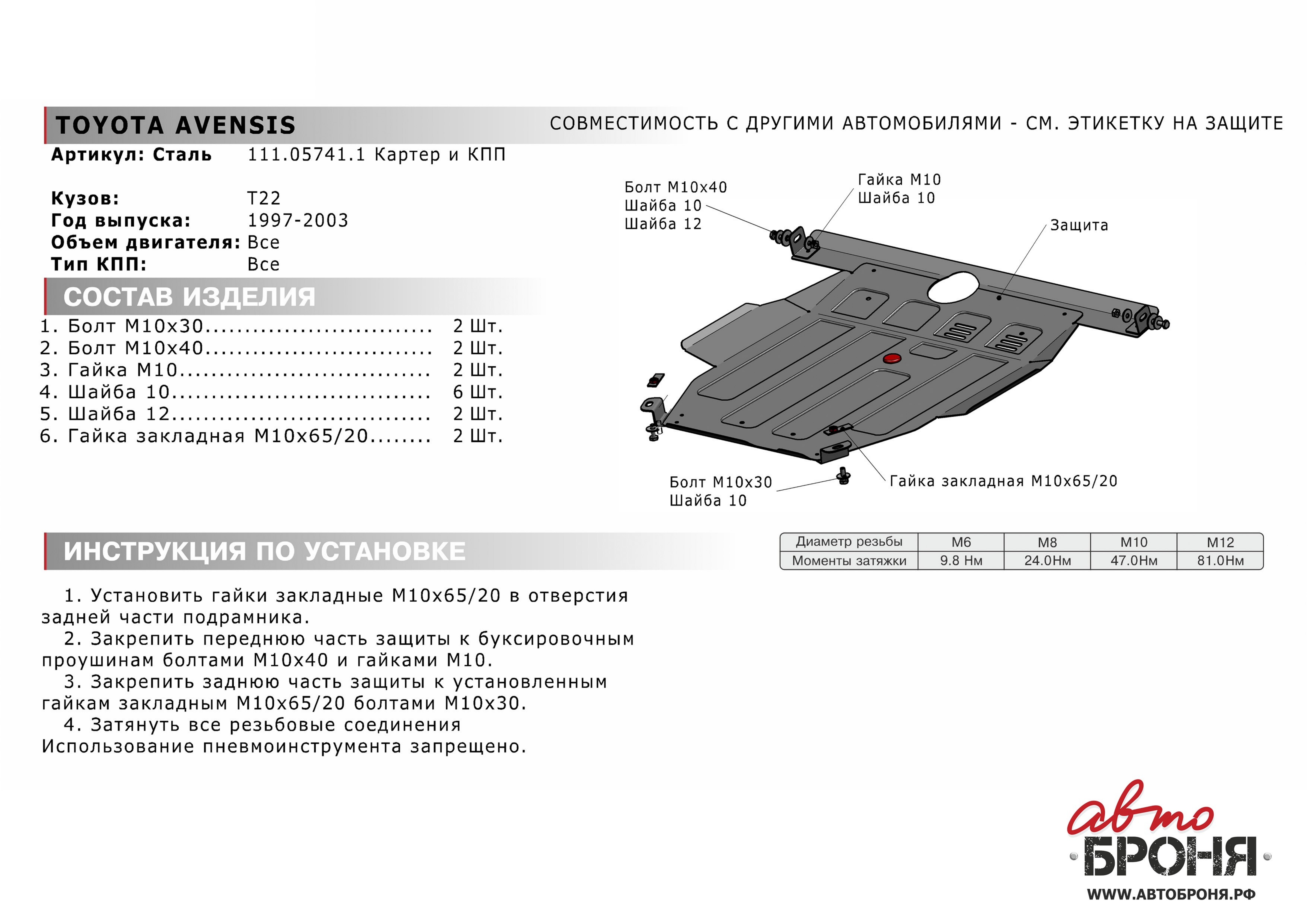 111.05701.1 | АвтоБроня | Защита картера + КПП (сталь 1,8 мм) + комплект крепежа для Toyota Avensis 2002-2008 (V - 1.8; 2.0) | 6 420 ₽ |