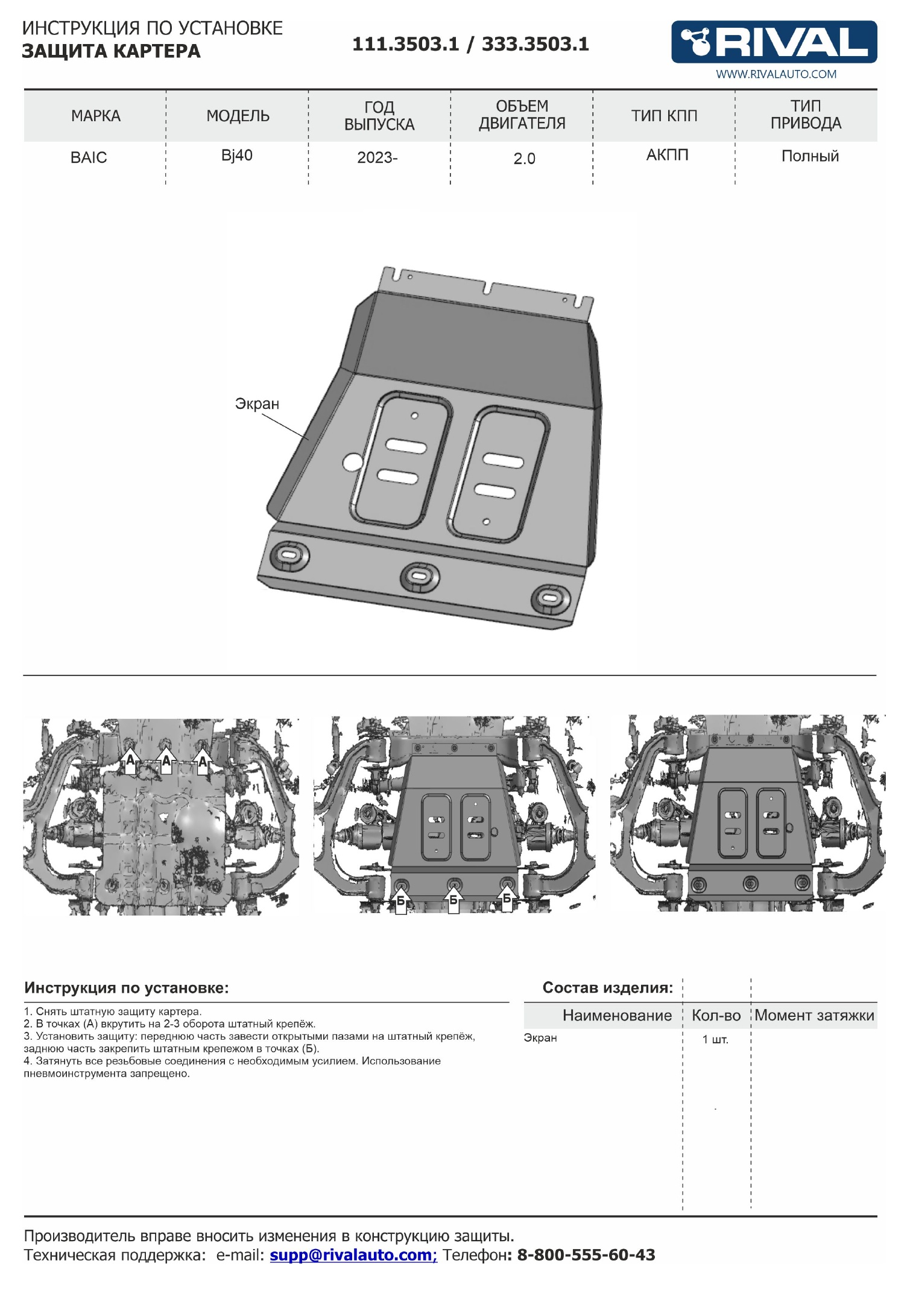 333.3505.1 | Rival | Защита РК (алюминий) + комплект крепежа для BAIC BJ40 2023- (V - 2.0, АКПП, полный) | 7 400 ₽ |