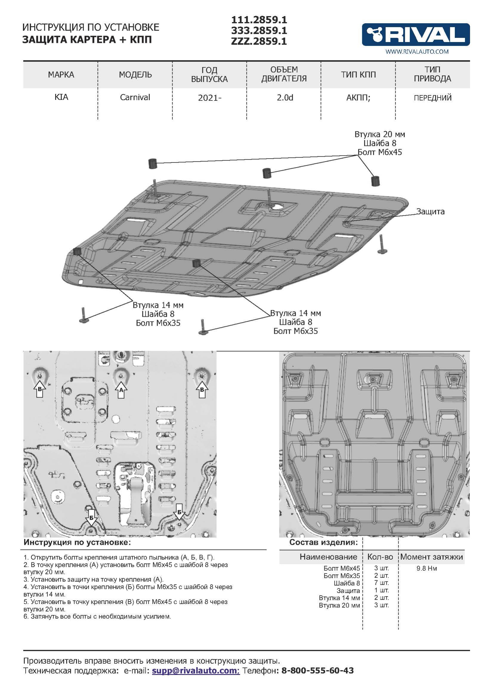 333.2859.1 | Rival | Защита картера + КПП (алюминий 3 мм) + комплект крепежа для Kia Carnival 2021- (V - 2.2d) | 6 140 ₽ |