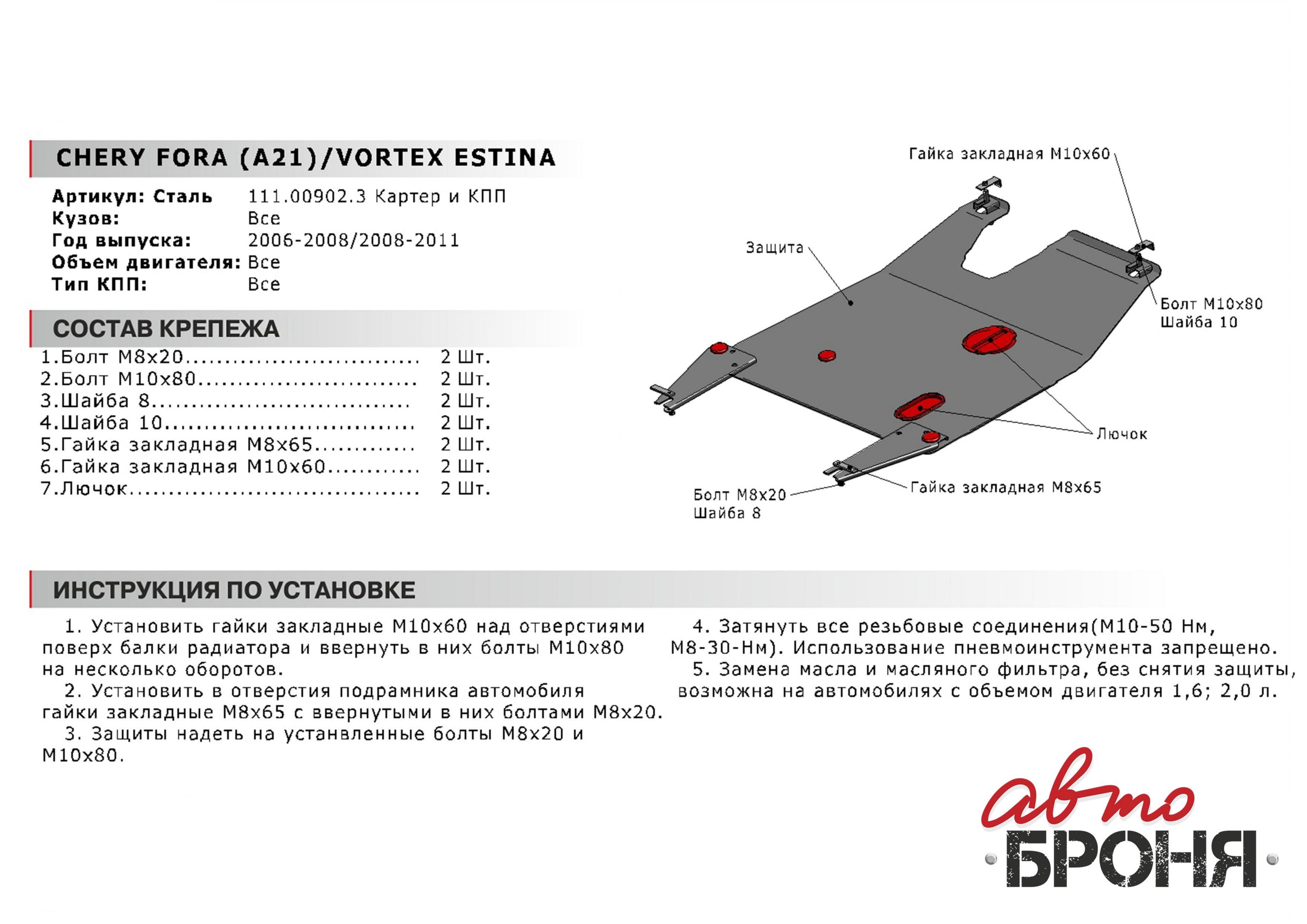 111.00902.3 | АвтоБроня | Защита картера + КПП (сталь 1,8 мм) + комплект крепежа для Chery Fora 2006-2008 (V - 1.6; 2.0) | 7 690 ₽ |