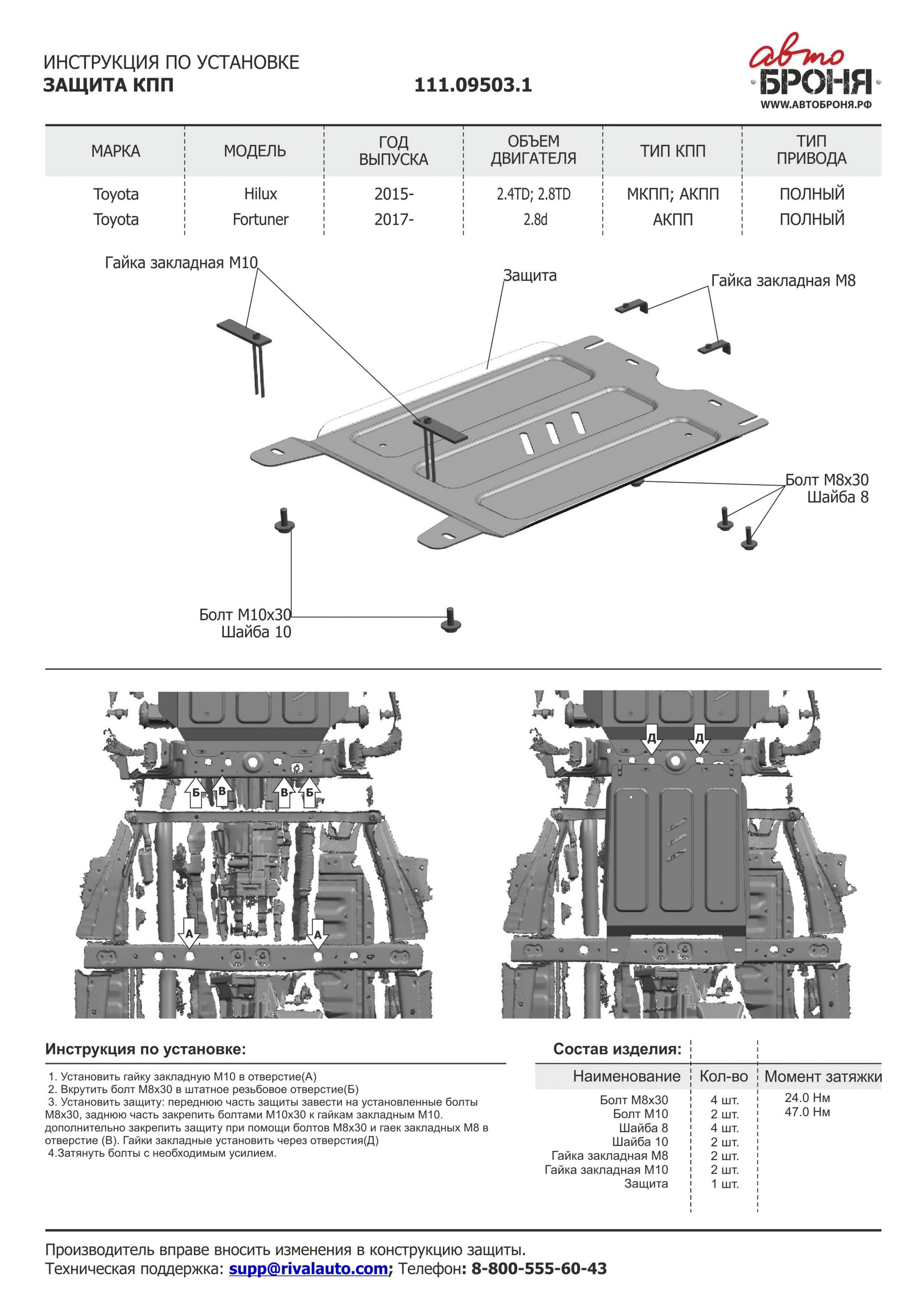 111.09503.1 | АвтоБроня | Защита КПП (сталь 1,8 мм) + комплект крепежа для Toyota Fortuner 2017- (V - 2.8d; 2.7 4WD), Toyota Hilux 2015- (V - 2.8d; 2.4d 4WD) | 3 520 ₽ |