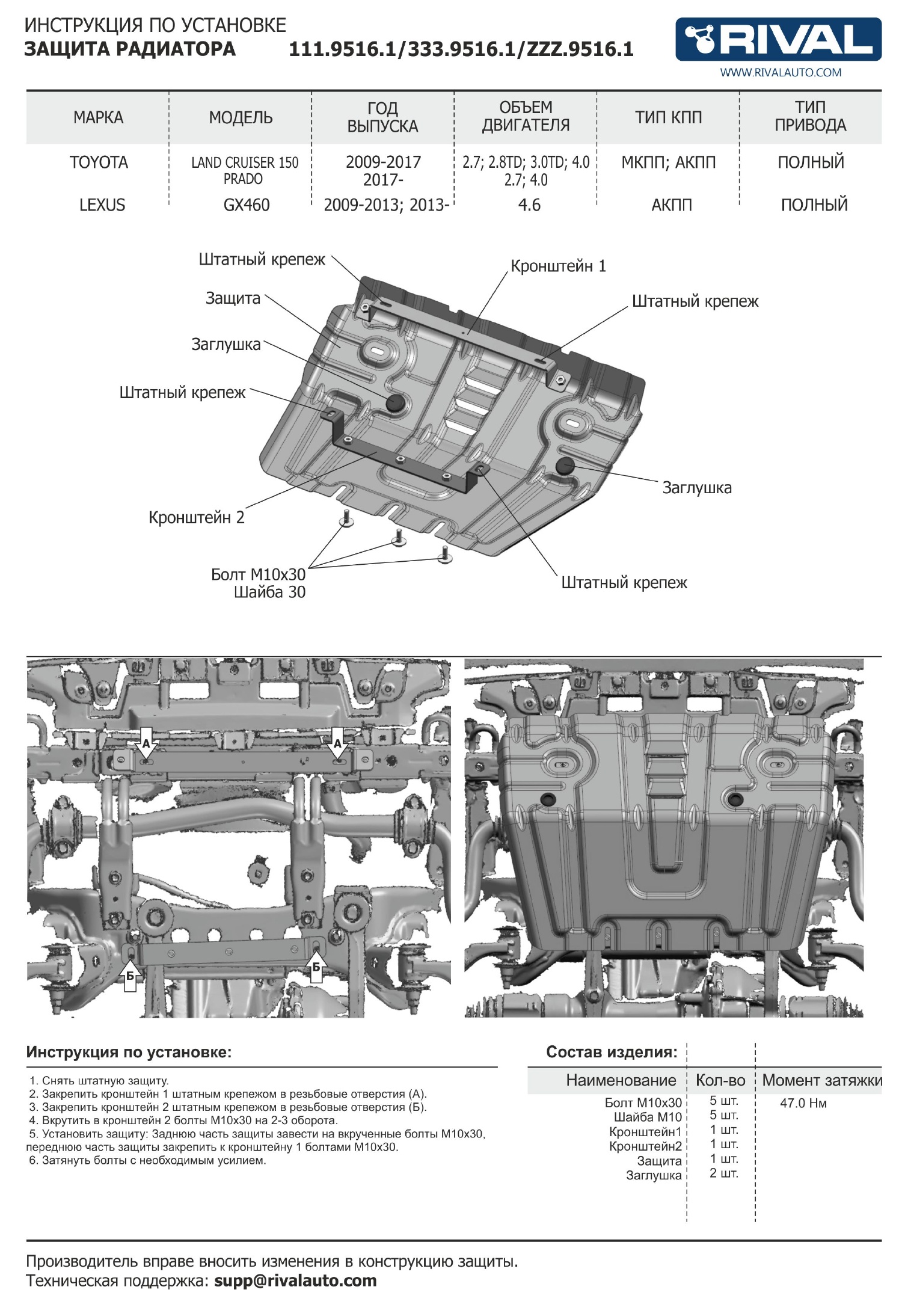 333.9516.1 | Rival | Защита радиатора (алюминий 3 мм) + комплект крепежа для Toyota Land Cruiser Prado 150 2009-2013, 2013-2017, 2017-2020, 2020-2023 (V - 2.7; 2.8d; 3.0d; 4.0), Lexus GX460 2009-2013, 2013-2023 (V - 4.6) | 14 950 ₽ |