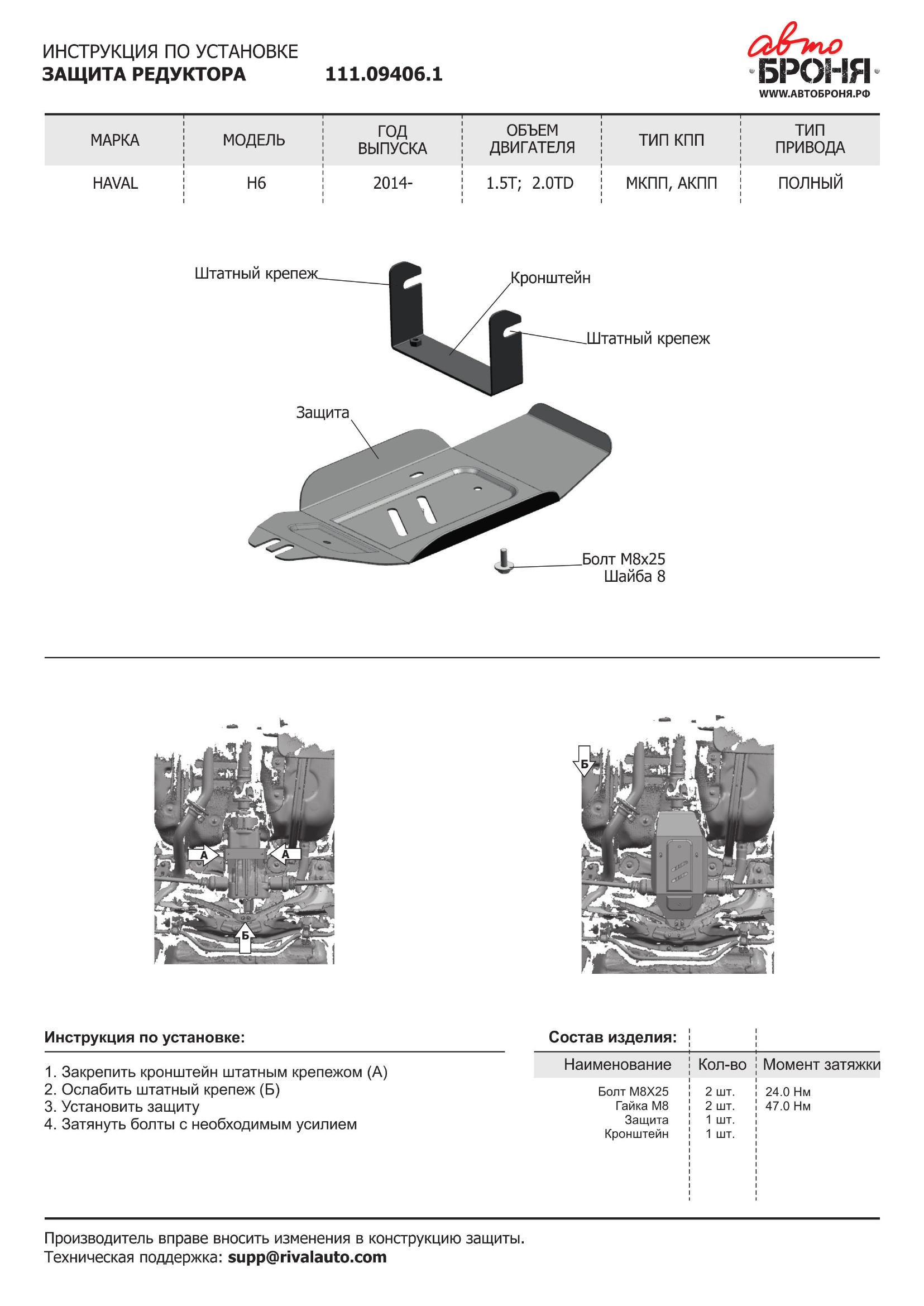 111.09406.1 | АвтоБроня | Защита редуктора (сталь 1,8 мм) + комплект крепежа для Haval H6 2014-2020 (V - 1.5T; 2.0TD, 4WD) | 2 850 ₽ |