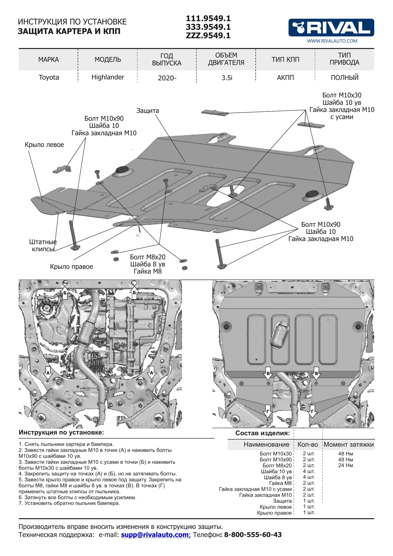 333.9549.1 | Rival | Защита картера + КПП (алюминий 3 мм) + комплект крепежа для Toyota Highlander 2020- (V - 3.5) | 18 480 ₽ |