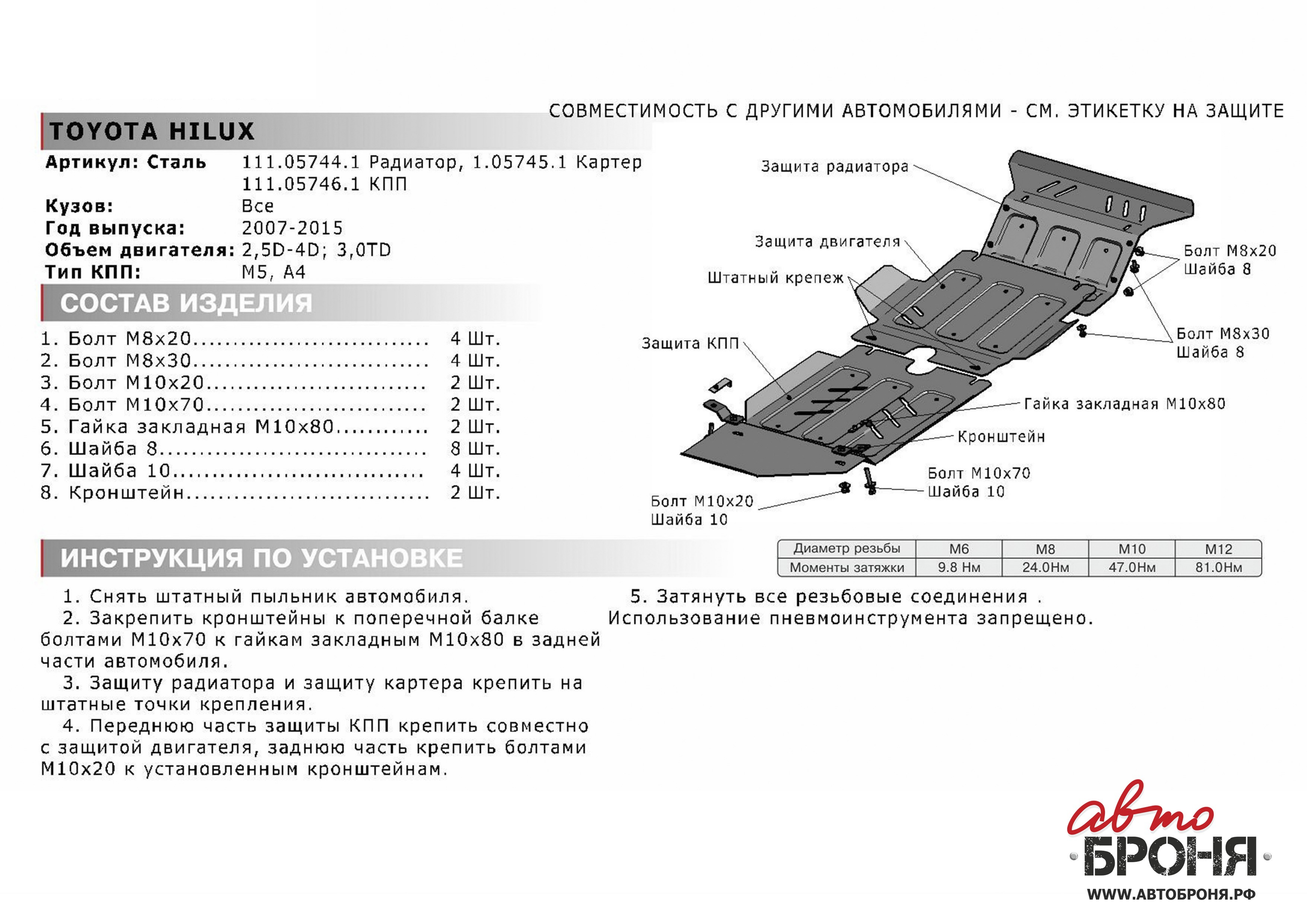 111.05746.1 | АвтоБроня | Защита КПП (сталь 1,8 мм) + комплект крепежа для Toyota Hilux 2007-2015 (V - 2.5d; 3.0d) | 3 520 ₽ |