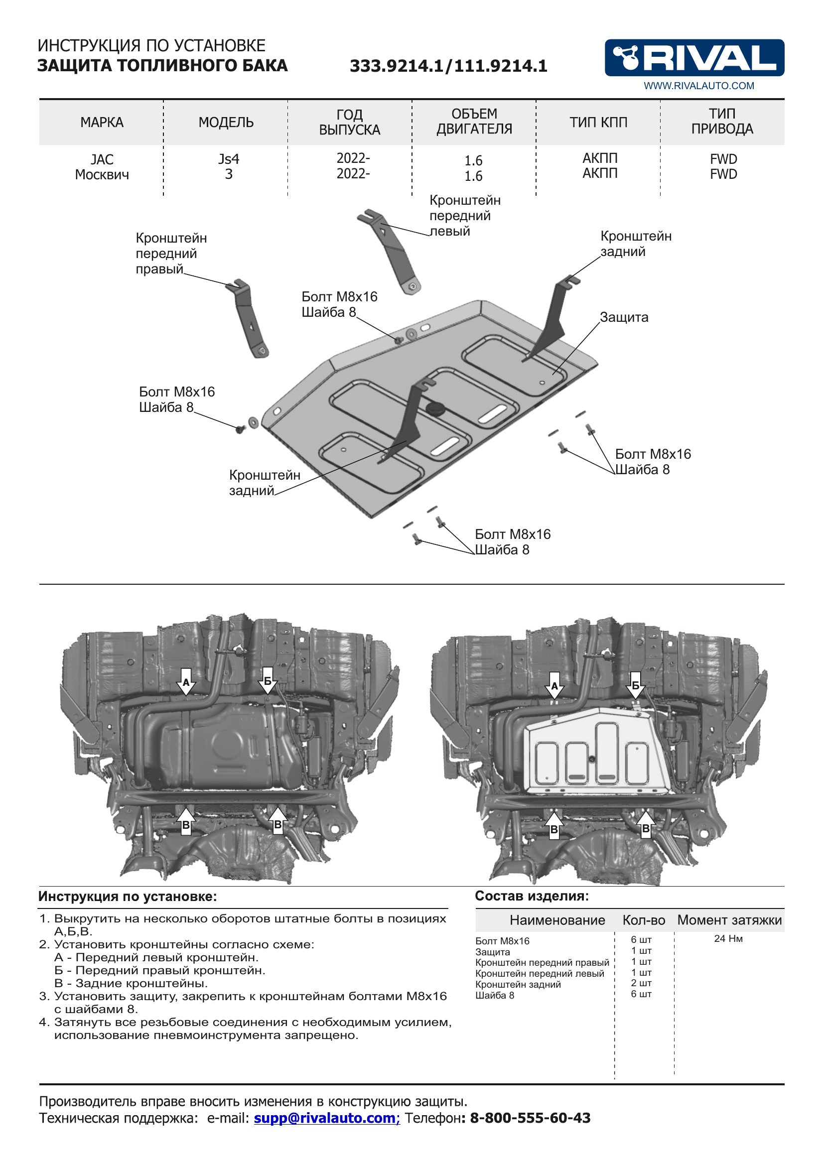 333.9214.1 | Rival | Защита топливного бака (алюминий 3 мм) + комплект крепежа для JAC JS4 2022- (V - 1.5, АКПП, FWD), Москвич 3 2022- (V - 1.5, АКПП, FWD) | 7 500 ₽ |