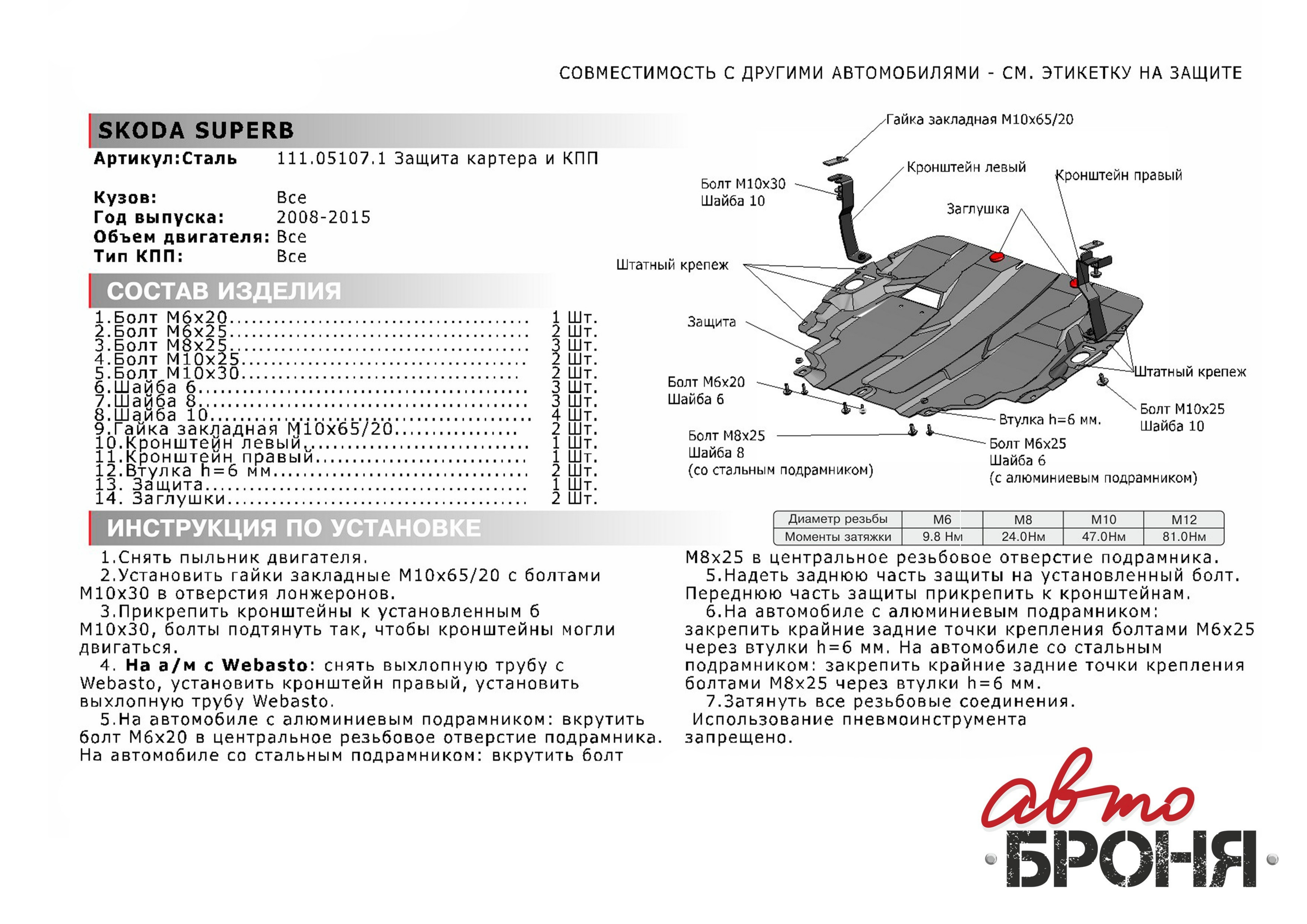 111.05128.1 | АвтоБроня | Защита картера + КПП (сталь 1,5 мм) + комплект крепежа для Skoda Octavia 2020- (V - 1.4; 1.6), Skoda Superb 2019-2024 (V - 2.0, FWD), Volkswagen Jetta 2020- (V - 1.4; 1.6), Volkswagen Passat 2019- (V - 1.4; 2.0), Skoda Superb 2015-2019 (V - 1.4; 1.8; 2.0), Volkswagen Golf 2012-2016, 2016- (V - 1.2; 1.4 122 л.с.), Volkswagen Passat 2015-2019 (V - 1.4; 1.8), Volkswagen Arteon 2020-2023 (V - 2.0), Audi A3 2012-2016 (V - 1.2; 1.4; 1.8; привод - все), Audi A3 2016- (V - 1.4), SEAT Leon 2013-2014 (V - 1.2) | 4 790 ₽ |