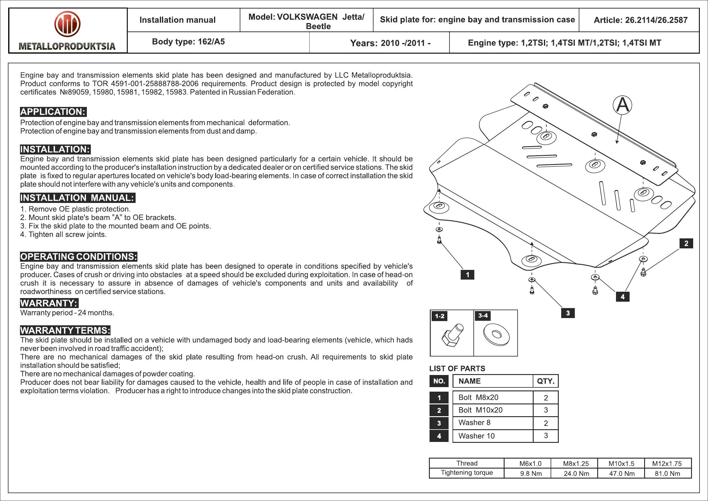 26.2114 | Sheriff | Защита картера двигателя, КПП (2 мм, сталь) для Volkswagen Jetta 2011-2019 (V = 1.2TSI; 1.4TSI; 2.0TSI), Volkswagen Beetle 2011-2019 (V = 1.2TSI; 1.4TSI), Volkswagen Beetle 2013-2015 (V = 1.2TSI (105 л.с.) DSG) | 6 880 ₽ |