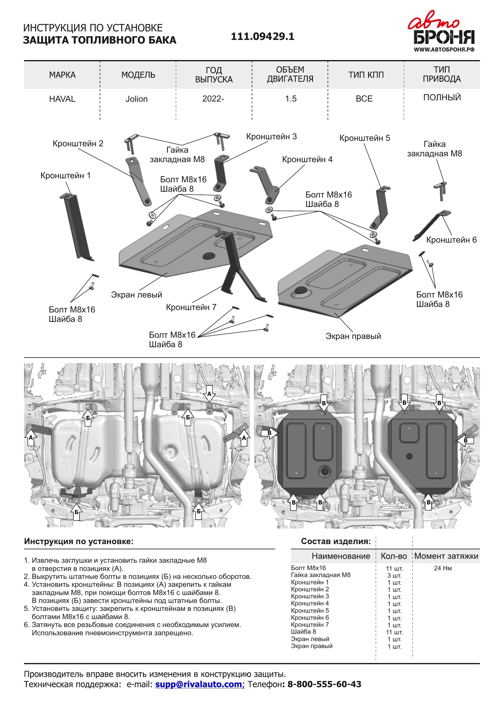 111.09429.1 | АвтоБроня | Защита топливного бака (сталь 1,5 мм) + комплект крепежа для Haval Jolion 2021- (V - 1.5T, МКПП/АКПП, 4WD), Haval H3 2024- (V - 1.5T, РКПП, 4WD) | 6 460 ₽ |