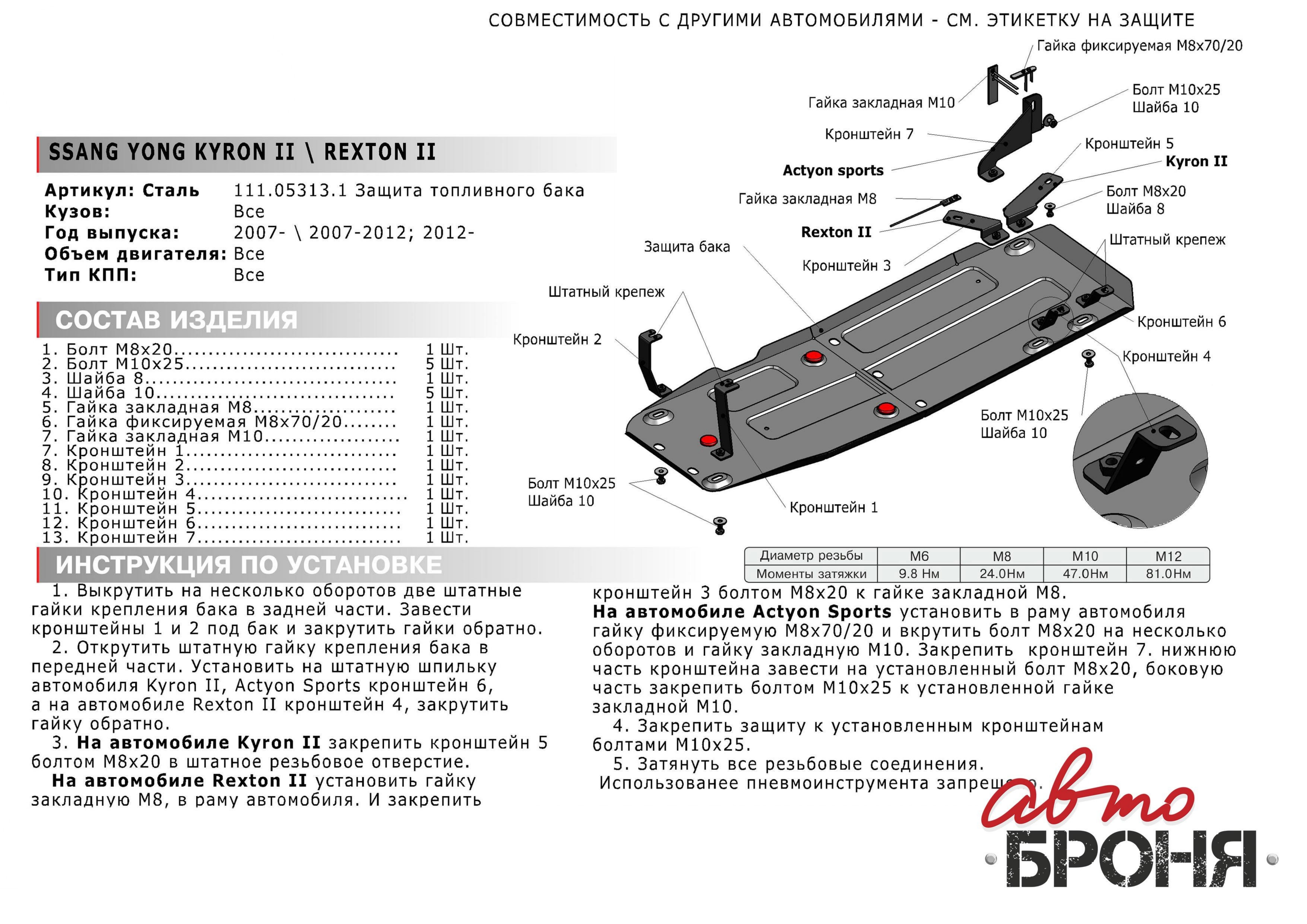111.05313.1 | АвтоБроня | Защита топливного бака (сталь 1,8 мм) + комплект крепежа для SsangYong Rexton 2007-2017 (V - 2.7d; 3.2), SsangYong Kyron 2007-2015 (V - 2.0d; 2.3), SsangYong Actyon Sport 2012-2016 (V - все) | 6 450 ₽ |