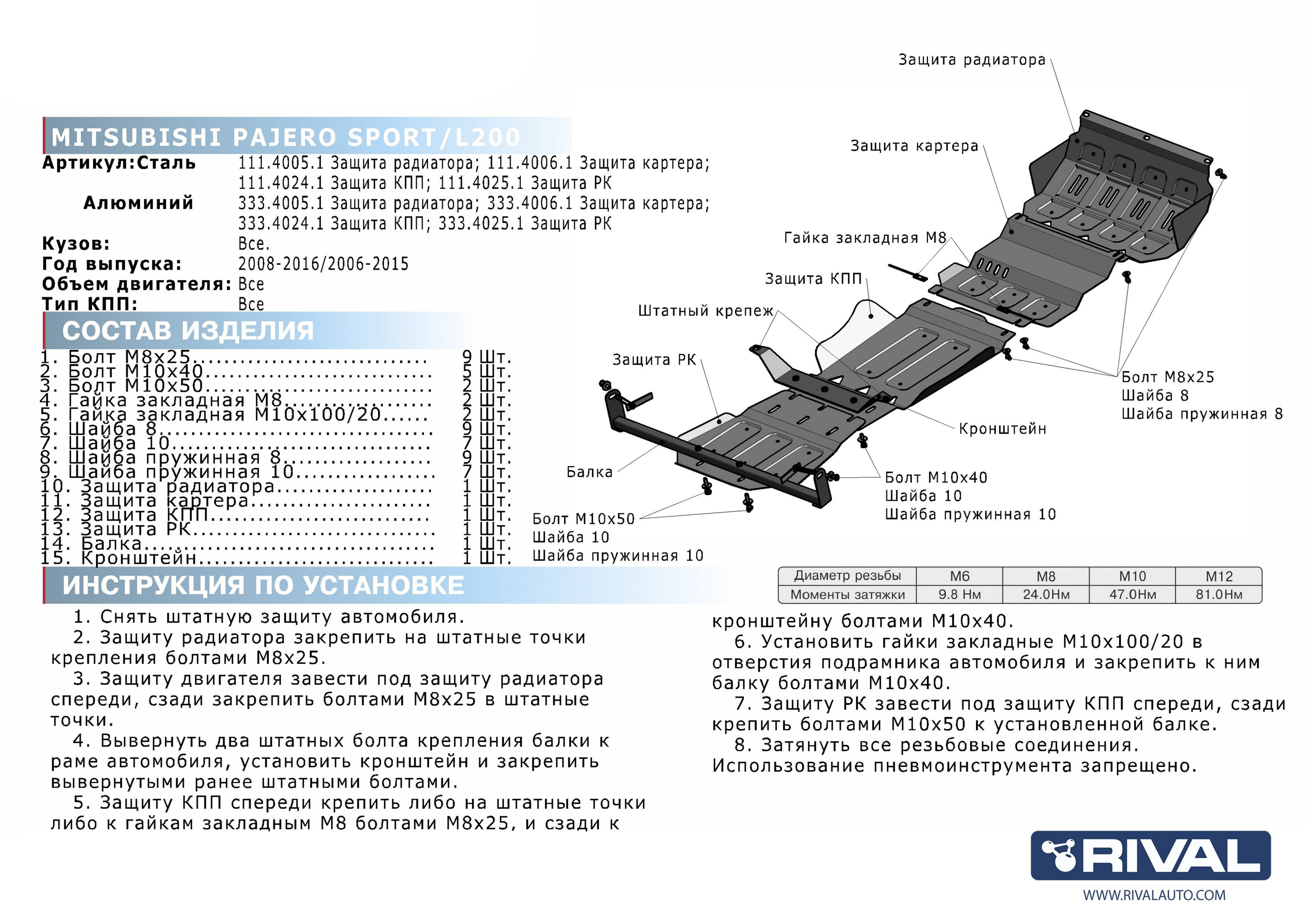 K222.4052.1 | Rival | Усиленный комплект защит радиатор + картер + КПП + РК (оцинкованная сталь, 1 лист AL) + комплект крепежа для Mitsubishi L200 2015-2023 (V - 2.4d; 2.4d H.P.), Mitsubishi Pajero Sport 2016- (V - 3.0; 2.4d), FIAT Fullback 2016-2019 (V - 2.4d) | 51 930 ₽ |