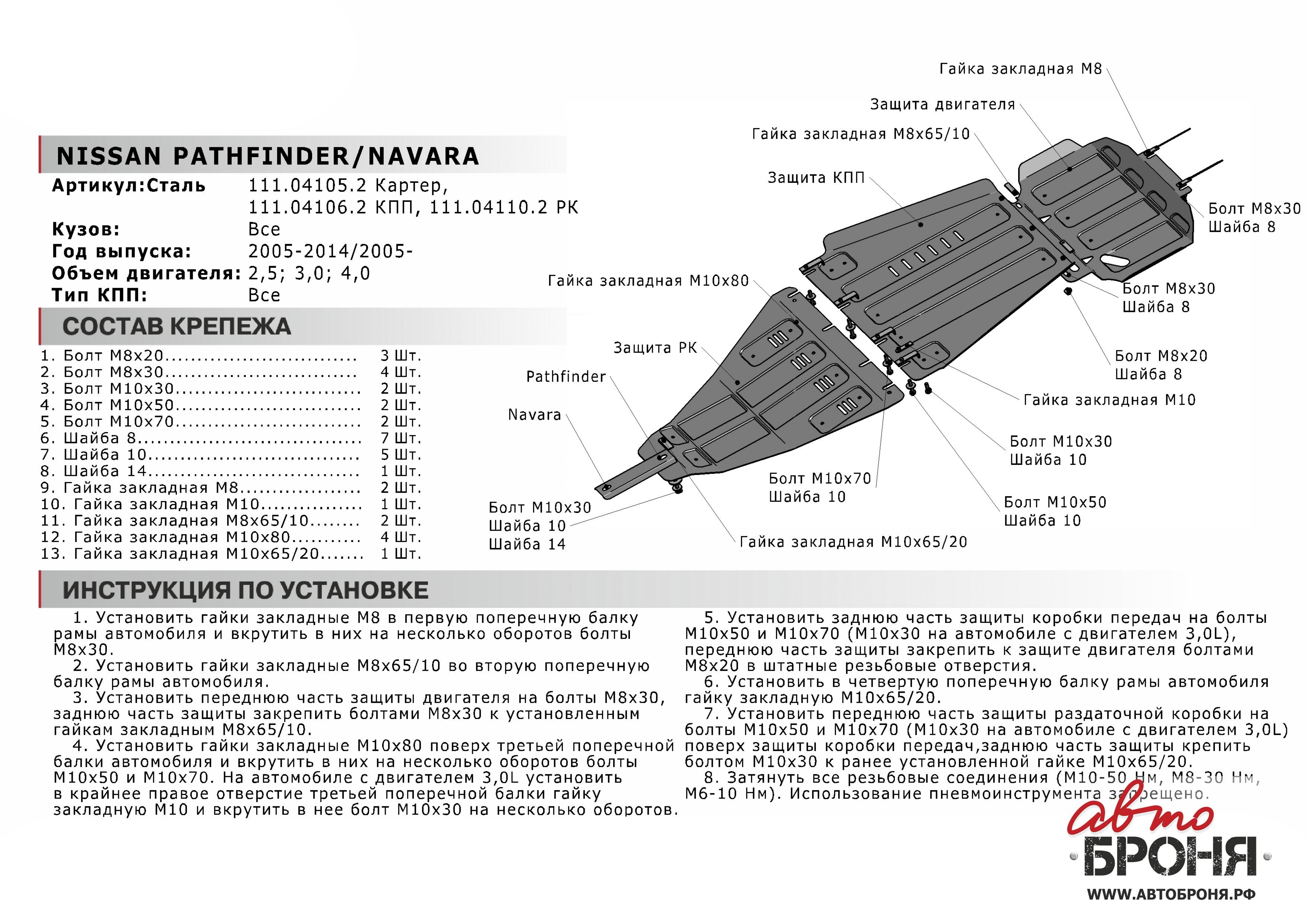 111.04106.2 | АвтоБроня | Защита КПП (сталь 1,8 мм) + комплект крепежа для Nissan Pathfinder 2005-2014 (V - 2.5; 3.0; 4.0), Nissan Navara 2005-2015 (V - 2.5d; 3.0d) | 4 330 ₽ |