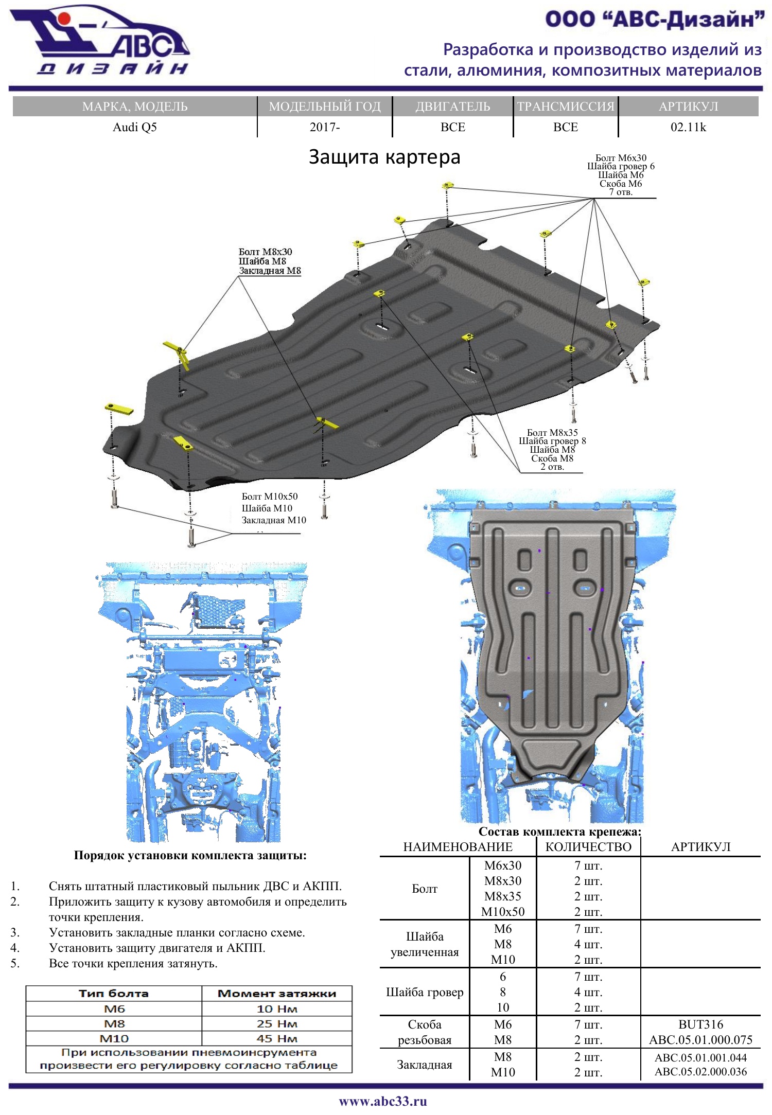 02.11k | АВС-Дизайн | Защита картера, КПП (композит 8 мм) для Audi Q5 2017-2024 (V - все) | 17 590 ₽ |