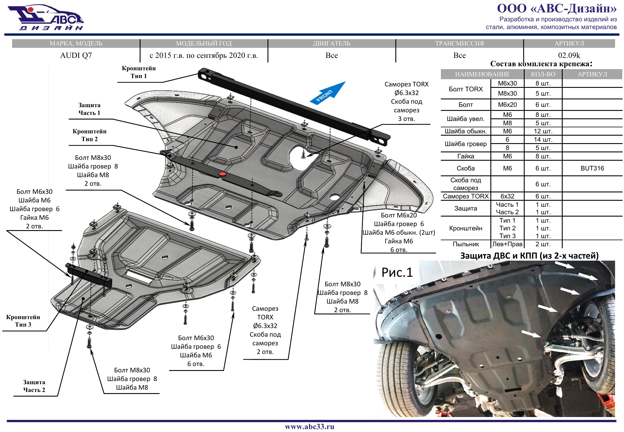 02.09k | АВС-Дизайн | Защита картера, КПП (композит 8 мм) для Audi Q7 2015-09/2020 (V - все, кроме 4.1d; 5.9d) (2 части) | 27 990 ₽ |