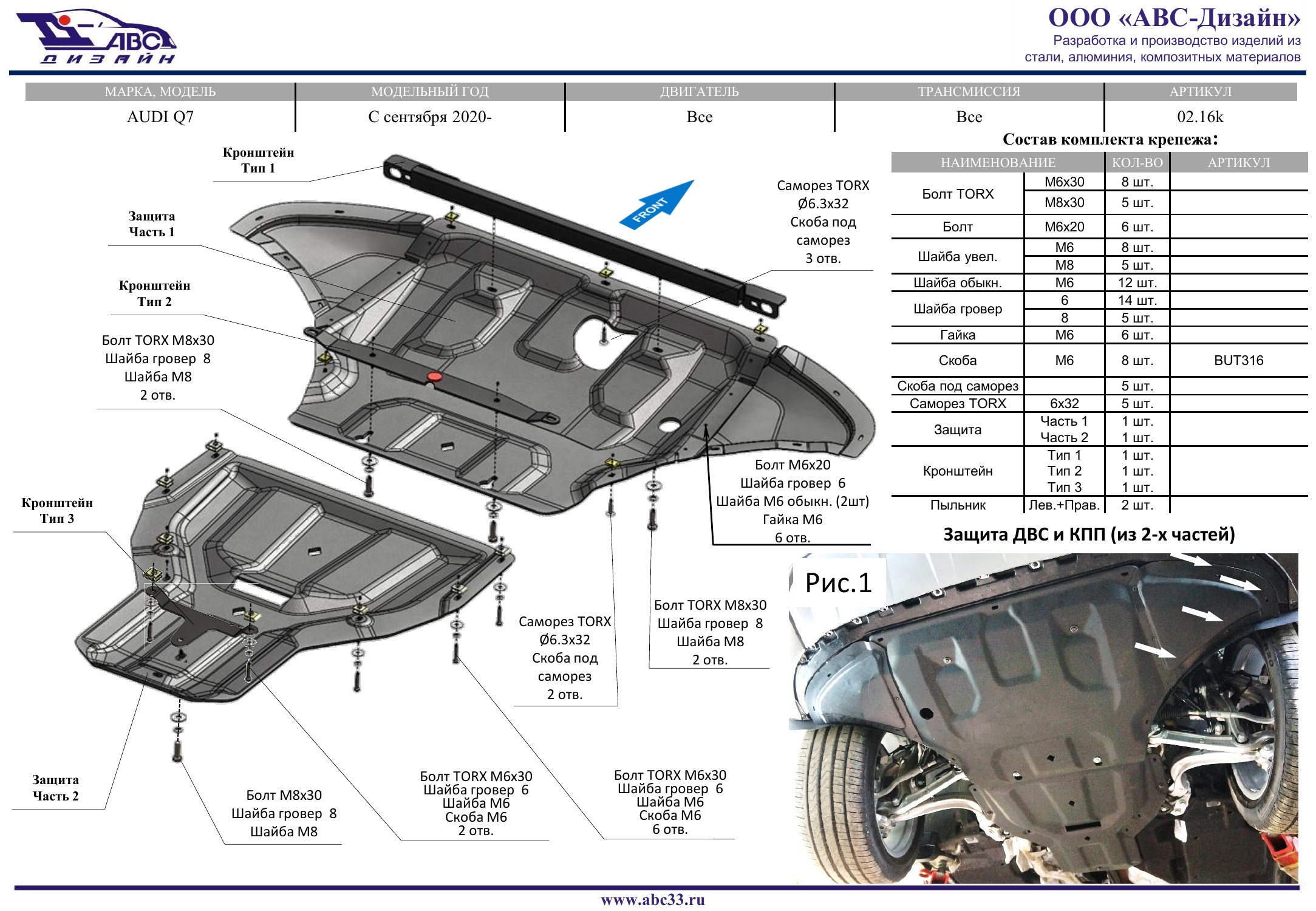 02.16k | АВС-Дизайн | Защита картера, КПП (композит 8 мм) для Audi Q7 09/2020- (V - все) (2 части) | 27 990 ₽ |