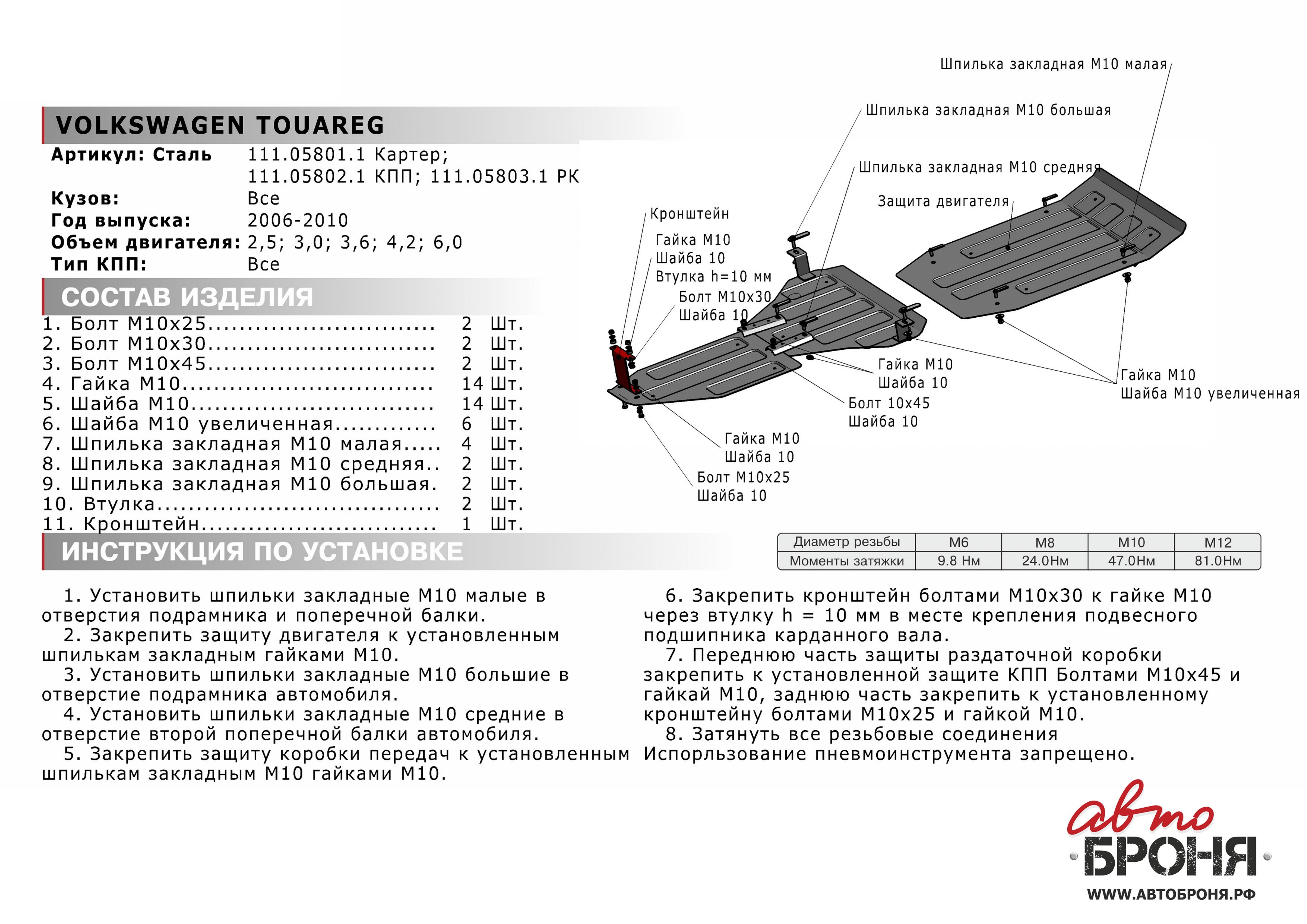 111.05801.1 | АвтоБроня | Защита картера (сталь 1,8 мм) + комплект крепежа для Volkswagen Touareg 2006-2010 (V - 2.5d; 3.0d; 3.6; 4.2; 6.0d) | 5 630 ₽ |