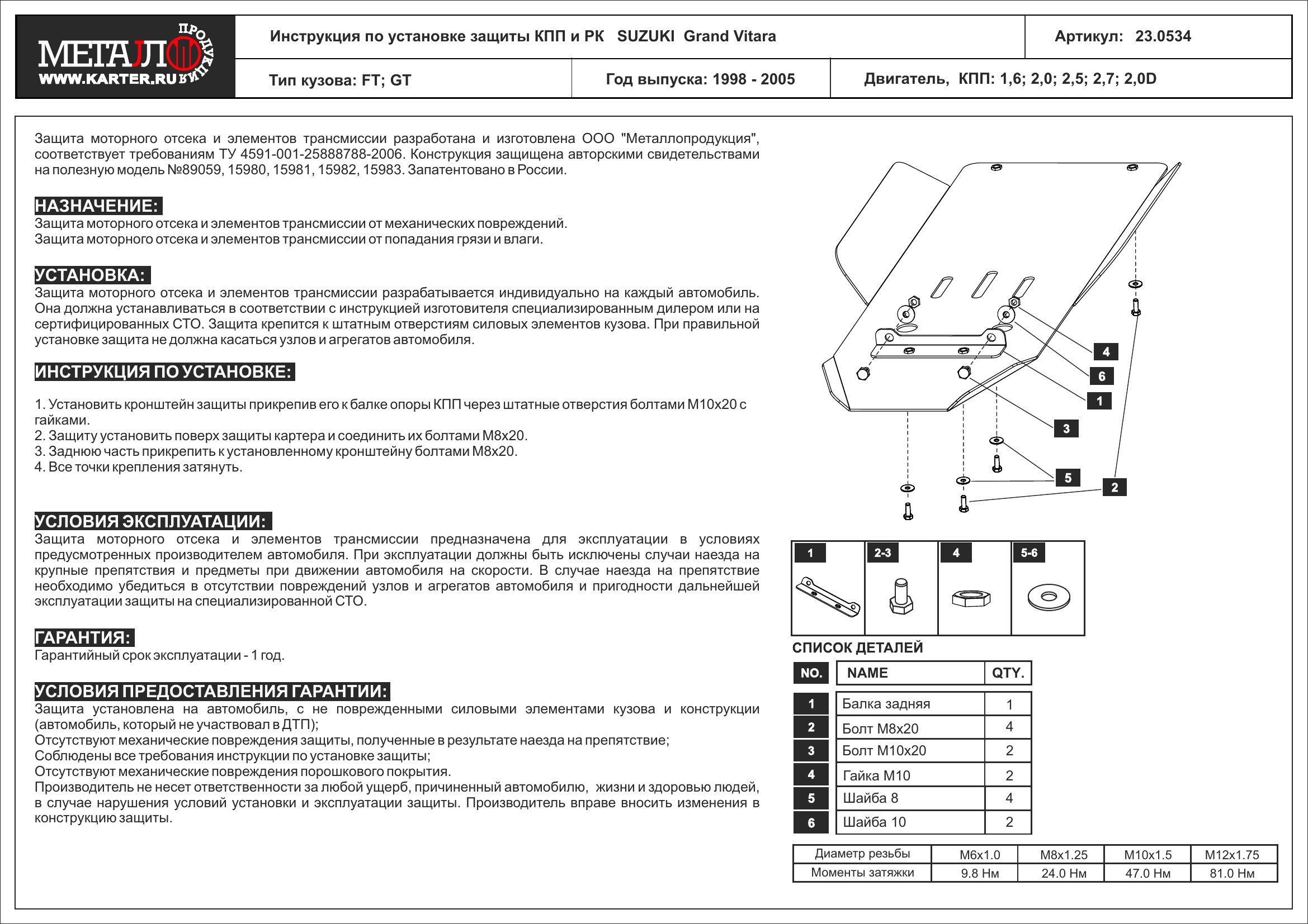 04.0534 | Sheriff | Защита КПП и РК (2,5 мм, сталь) для Chevrolet Tracker 2000-2004 (V = 1.6; 2.0), Suzuki Escudo 1997-2005 (V = 2.7), Suzuki Grand Vitara 1998-2005 (V = 1.6; 2.0; 2.5; 2.0d) (устанавливается совместно с 23.0480) | 5 340 ₽ |
