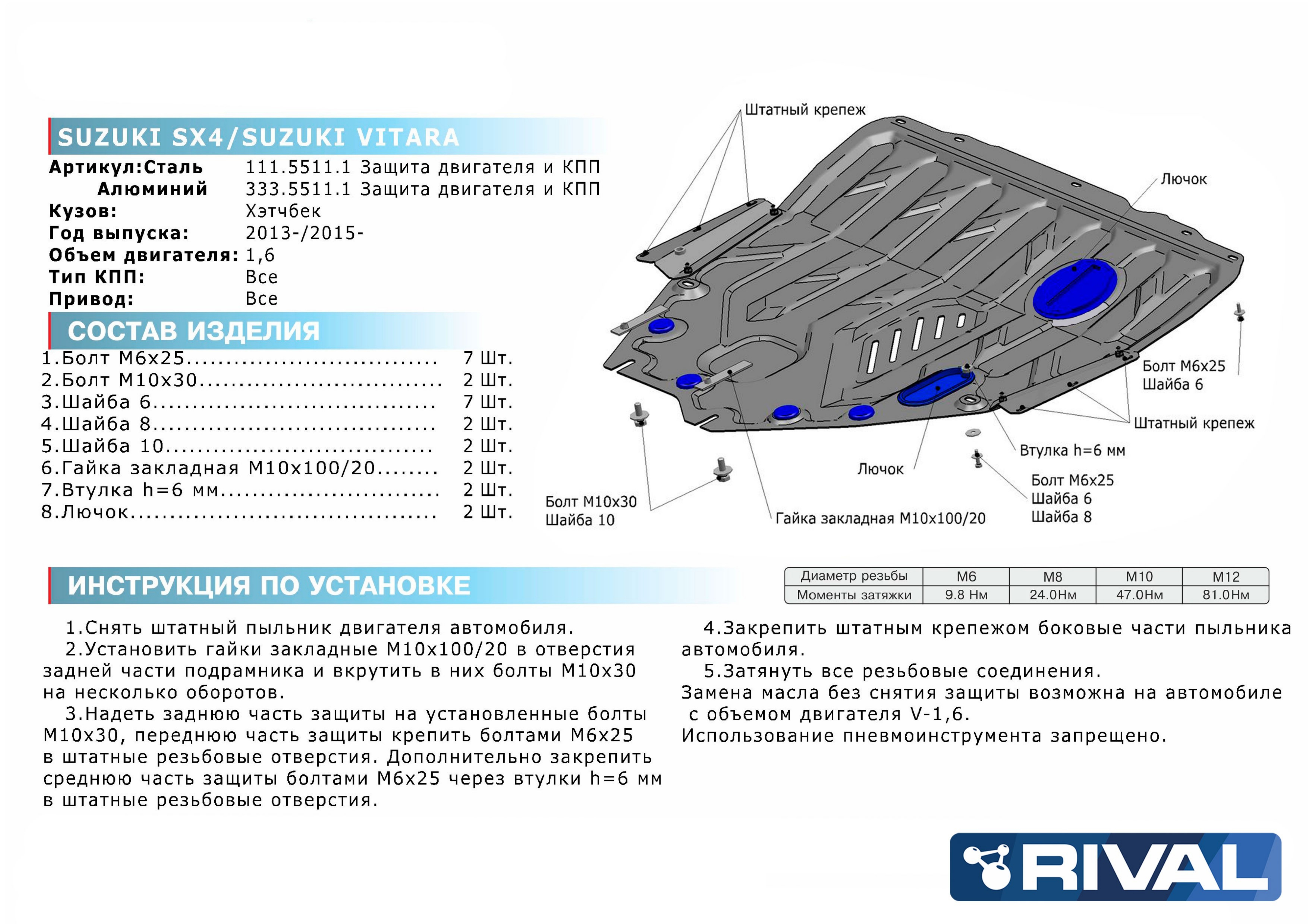 333.5511.1 | Rival | Защита картера + КПП (алюминий 3 мм) + комплект крепежа для Suzuki SX4 S-Cross 2013-2021 (V - 1.6), Suzuki Vitara 2015- (V - 1.6) | 15 700 ₽ |