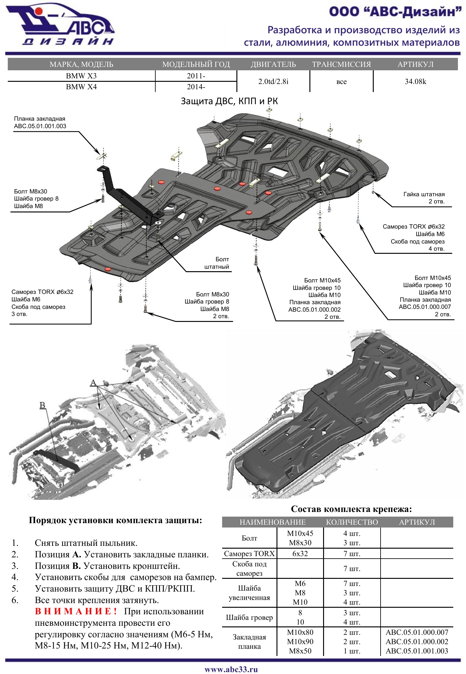 34.08ABC | АВС-Дизайн | Защита картера, КПП (алюминий 4 мм) для BMW X3 F25 2011-2017 (V - все), BMW X4 F26 2014-2018 (V - все) (2 части) | 23 590 ₽ |