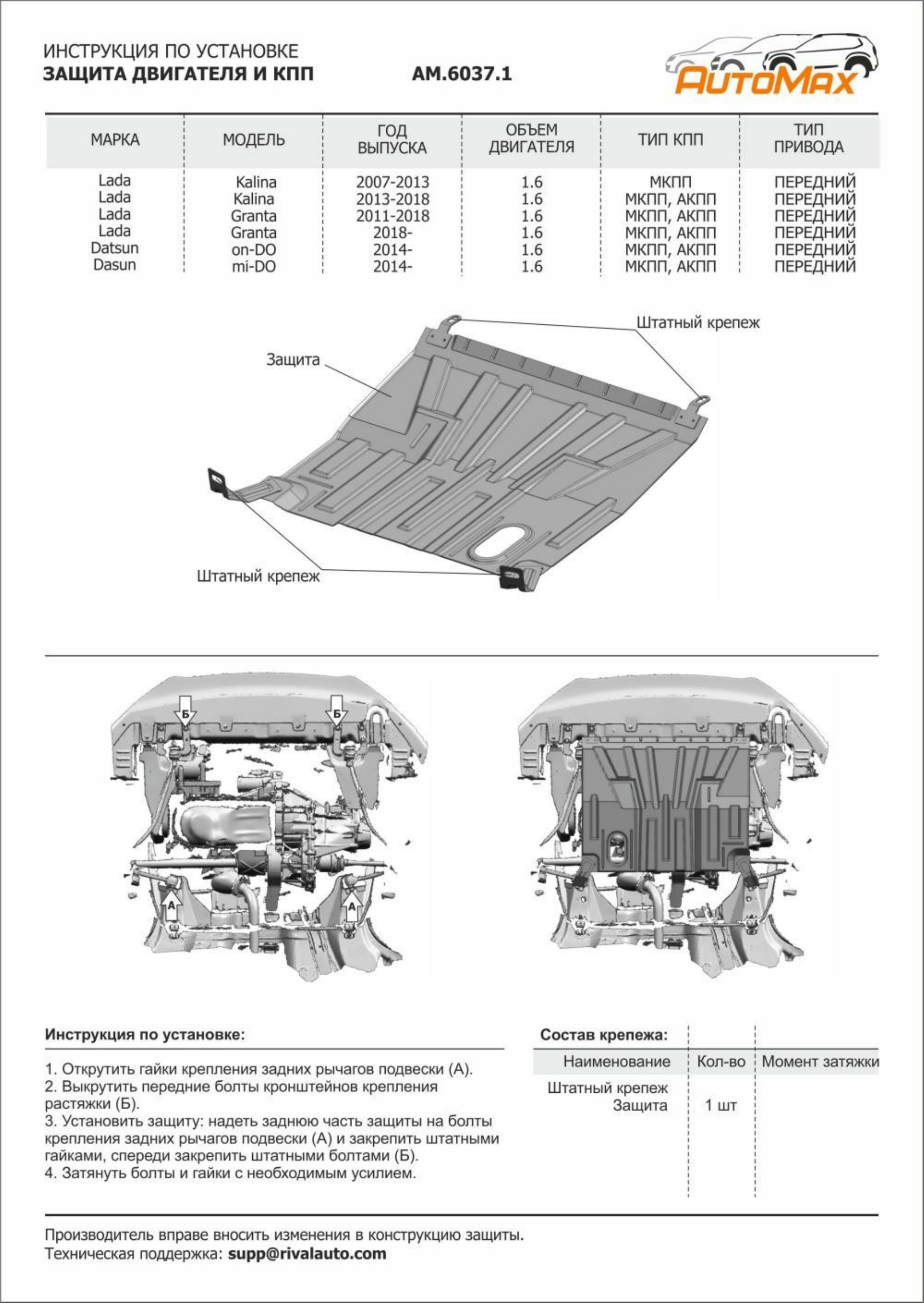 AM.6037.1 | AutoMax | Защита картера + КПП (сталь 1,4 мм) без крепежа для Lada Granta 2011-2018, 2018- (V - все), Lada Kalina 2007-2013, 2013-2018 (V - все), Datsun mi-DO 2015-2020 (V - 1.6), Datsun on-DO 2014-2020 (V - 1.6) | 2 430 ₽ |