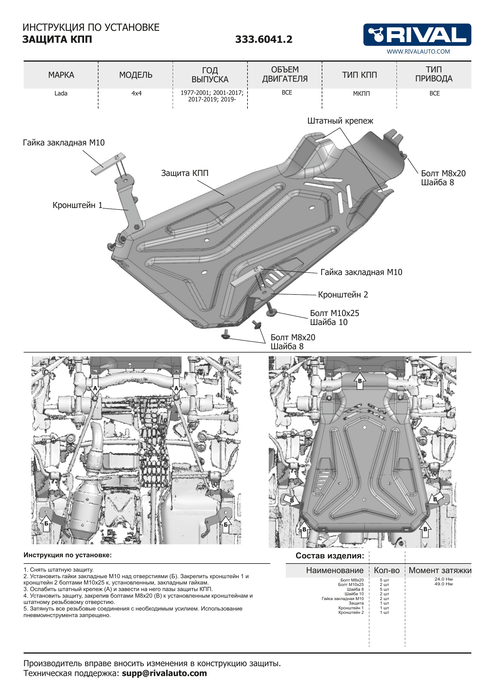 333.6041.2 | Rival | Защита КПП (алюминий 3 мм) + комплект крепежа для Lada Niva Legend 2021- (V - все), Lada 4x4 1977-2021 (V - все) | 13 160 ₽ |